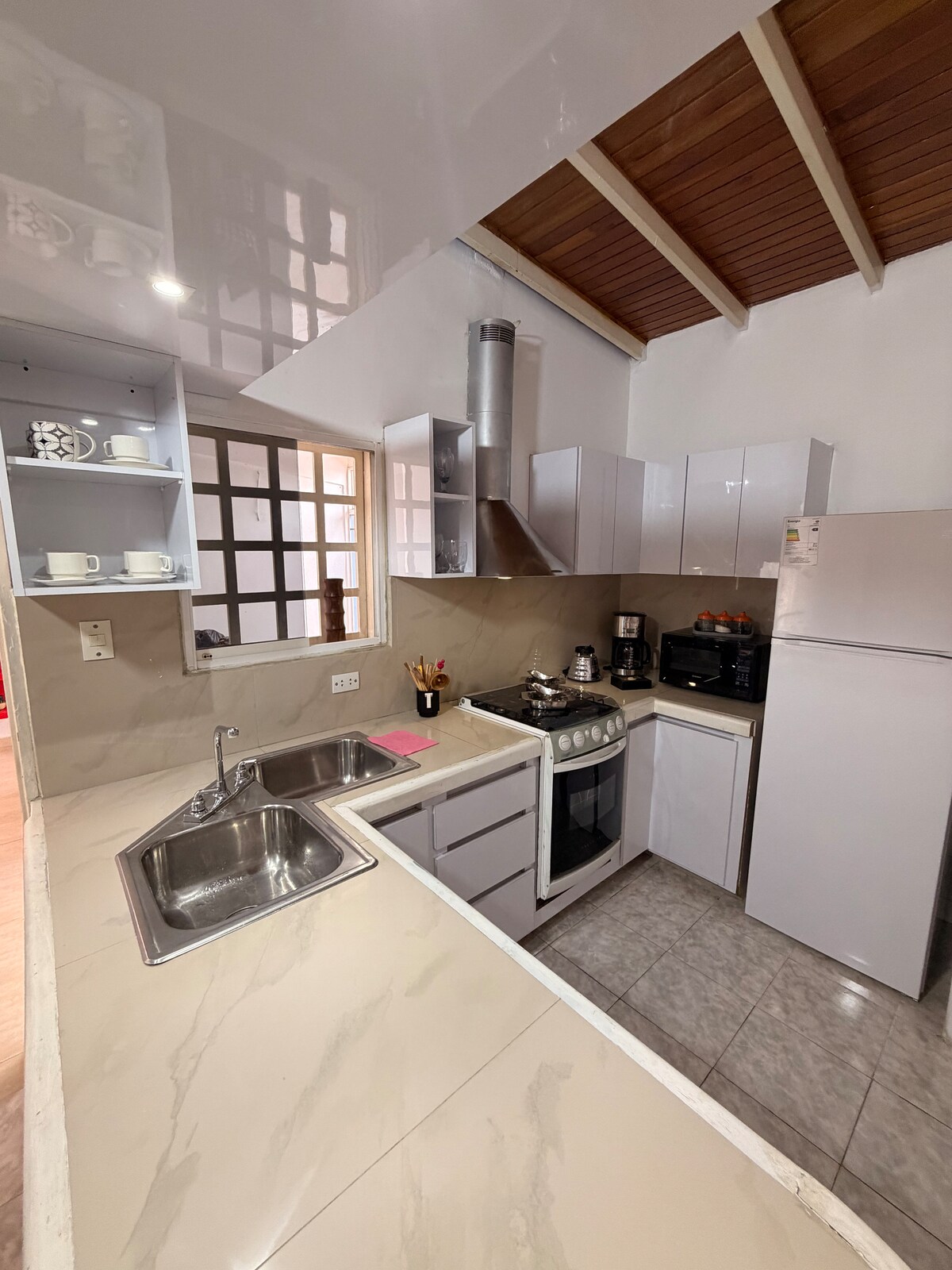 Casa equipada para 6 huéspedes en Cabudare, a 15 minutos del aeropuerto y de los C.C. Sambil Barquisimeto y Las Trinitarias. A 5 minutos caminando de Farmatodo Ribereña, supermercado y gimnasio. Ubicada dentro de conjunto residencial privado con vigilancia 24/7, ofrece comodidad, seguridad y fácil acceso a la Av. Ribereña. Ideal para familias o viajes de trabajo.