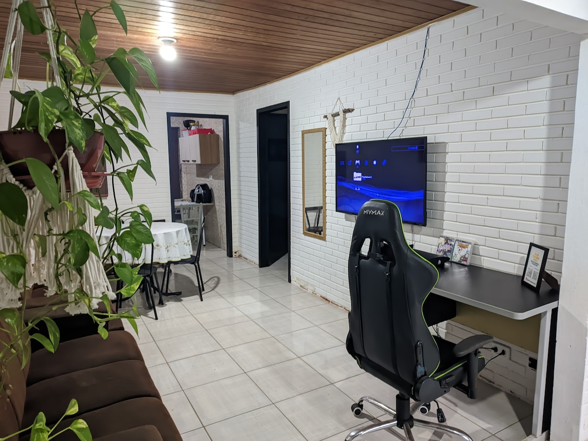 Excelente casa de praia com piscina, próxima do mar. Área gourmet com sala integrada e churrasqueira ao lado da piscina. Cozinha bem equipada. Sala com ar-condicionado; TV smart de 45 polegadas. 3 dormitórios, sendo 1 suíte, todos com ventilador de teto; 1 banheiro social; 1 lavabo externo; Máquina de lavar-roupas; Cozinha equipada com cafeteira, liquidificador, geladeira, fogão, taças, copos, panelas, pratos e talheres para 6 pessoas; 4 cadeiras de praia.