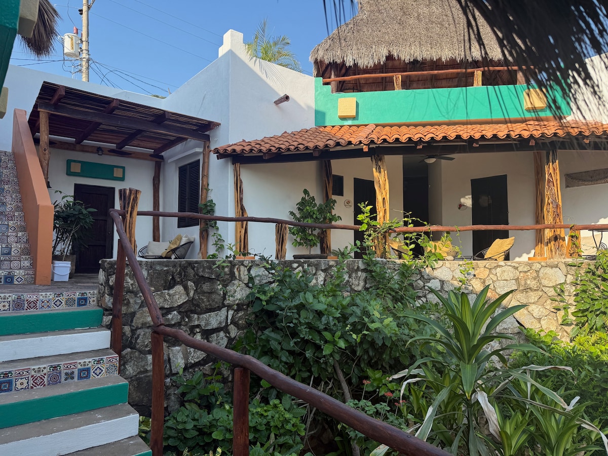 Casa entera, a dos cuadras de la playa, cocina equipada, comedor, sala, 2 dormitorios ubicados en planta alta, el dormitorio principal con baño privado y cama king size, estancia, 2 baños completos en áreas comunes, patio y cochera para 1 Auto. En los alrededores de la casa encuentras de todo desde un restaurante Japonés hasta una fonda para desayunar unos ricos chilaquiles el supermercado se encuentra a unos pasos de la casa, el transporte público pasa en la esquina y el taxi a dos cuadras.