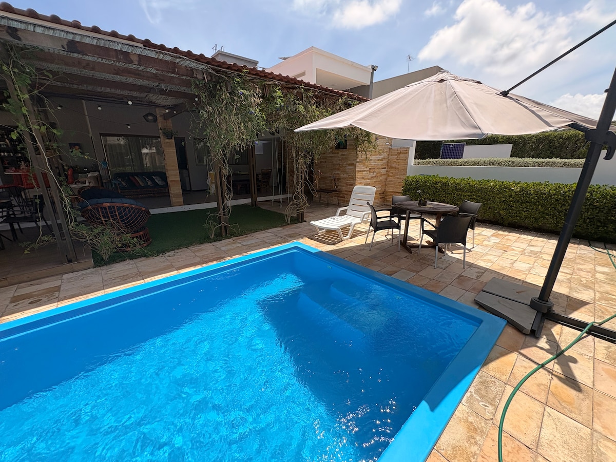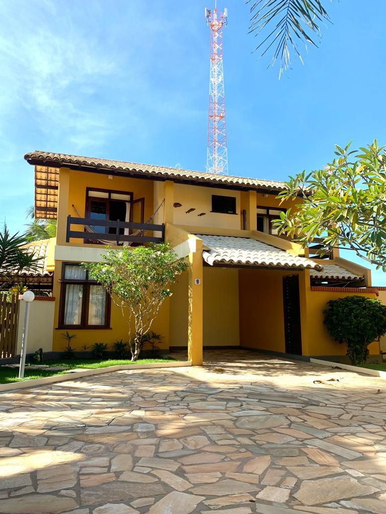 De frente para o mar, a casa acomoda 9 pessoas e possui excelente área externa, com churrasqueira, chuveirão e garagem. Sala com TV, sofá e mesa de jantar, cozinha equipada e área de serviço. 03 quartos (2 suítes com varanda). Todos os quartos possuem ar condicionado. 3 banheiros recém reformados e 1 lavabo. Casa fica em condomínio seguro, com porteiro, e excelente área de lazer com piscina. Fica próximo a um mercadinho e na rua do condomínio há uma deliciosa pizzaria.