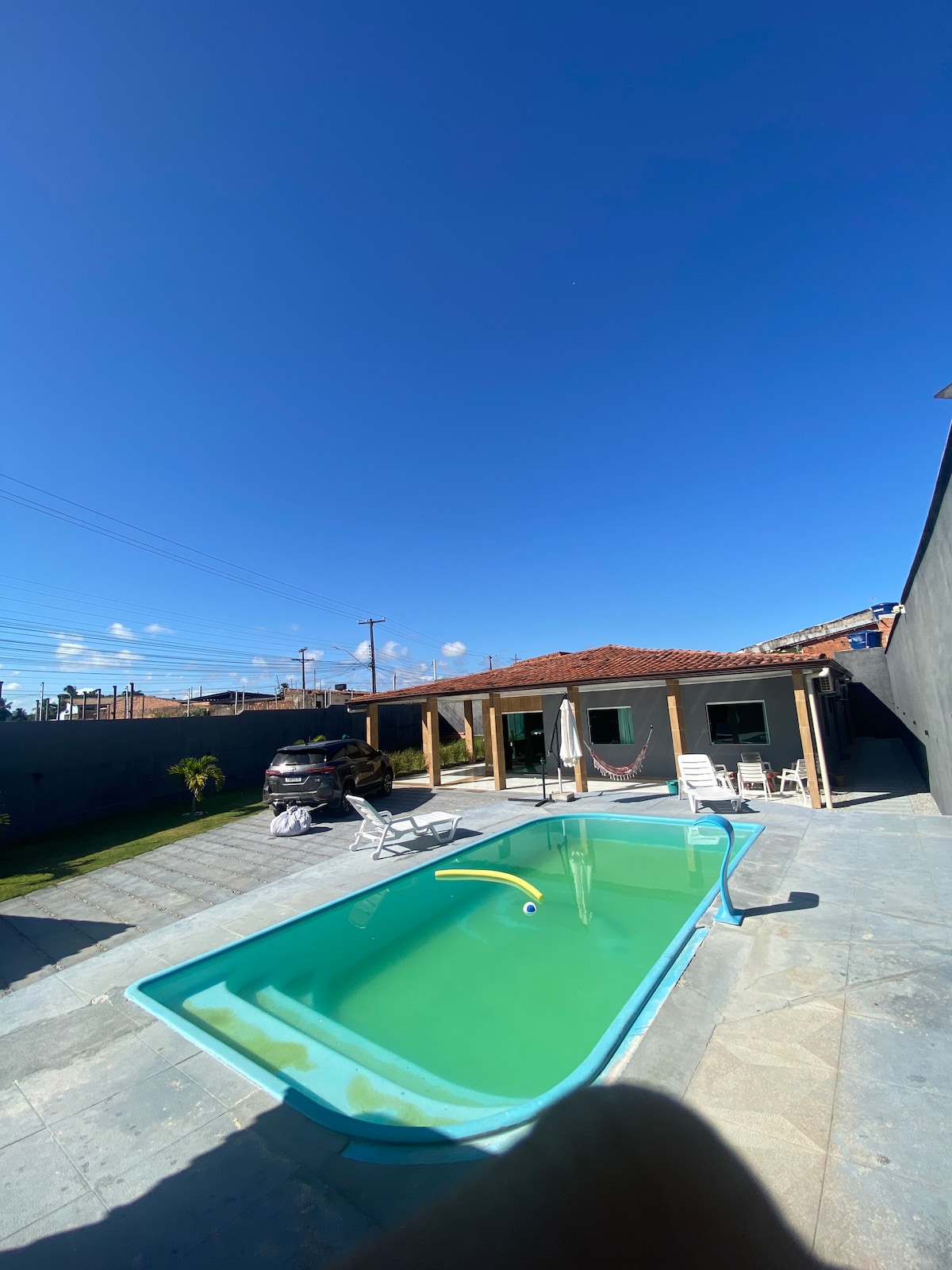 A casa é confortável e dispõe de 3 quartos, sendo duas suítes com varanda no pavimento superior (acesso via escada), sala de estar/jantar, área externa de lazer com chuveirão e churrasqueira, área de serviço e cozinha equipada com eletrodomésticos e utensílios. Além do acesso inteiro a casa e estacionamento privativo para um carro, pode-se utilizar áreas externas de lazer comuns ao condomínio, que contam com uma piscina e churrasqueira. Dispõe de wi-fi na sala e ar cond. novos nos quartos.