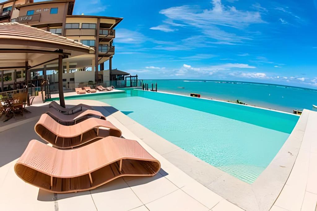 Apartamento com vista espetacular da melhor praia da Barra de São Miguel, com visão ampla da praia e do mar a partir de todos os cômodos. Único disponível para locação na parte frontal do resort. Decoração, iluminação e móveis de alto padrão, com duas televisões de led e ar-condicionados splits. Cozinha americana equipada e varanda voltada para o mar. Prédio com piscina, salão de jogos, Home theater, quadra de squash, academia e spa com sauna, jacuzzi e ofurô. Duas vagas de garagem no subsolo.