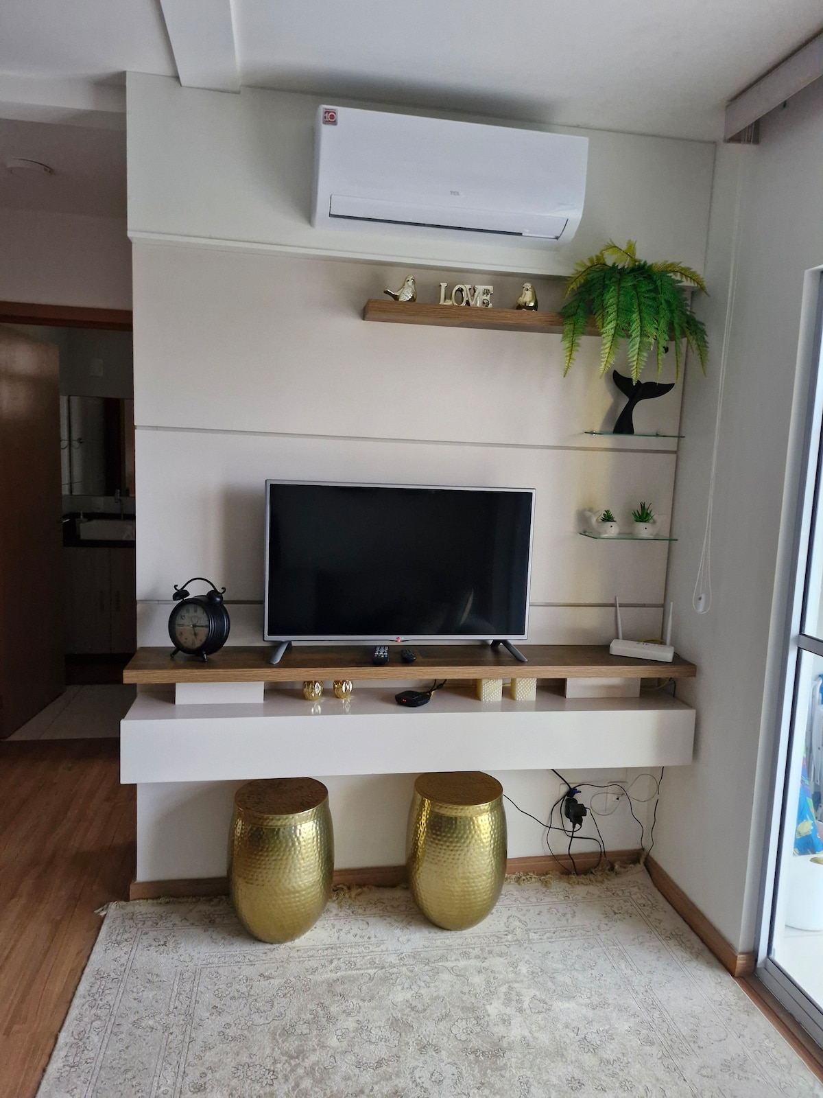 O apartamento tem dois quartos, sala integrada com a cozinha e lavanderia, banheiro e varanda com churrasqueira (também tem uma rede para descansar), tem cadeiras de praia e guarda Sol. Em um quarto tem cama de casal e no outro cama de casal e uma de solteiro. Fica pronto para você com roupa de cama, banho e mesa, tudo simples mas bem cuidado. Tem louça e equipamentos para a cozinha, geladeira, forno elétrico e micro-ondas; televisor e internet. Possui uma vaga de garagem coberta.