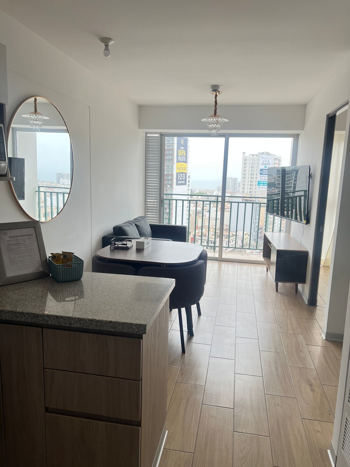 Departamento con hermosa vista al mar, cerca al Aeropuerto y de los mejores lugares turísticos de Lima, amoblado con todas las comodidades. Consta de: Sala, escritorio, Kitchenette, 1 Dormitorio con cama queen, 1 baño y una Terraza con vista al mar. Con áreas sociales: Sala de Cine, Sala de juegos, Patio con Fogón, Lavandería, Sala de Adultos, Gimnasio, Sauna, Ambientes de Parrillas, Terraza con Tina de hidromasajes, Piscina para adultos y niños.