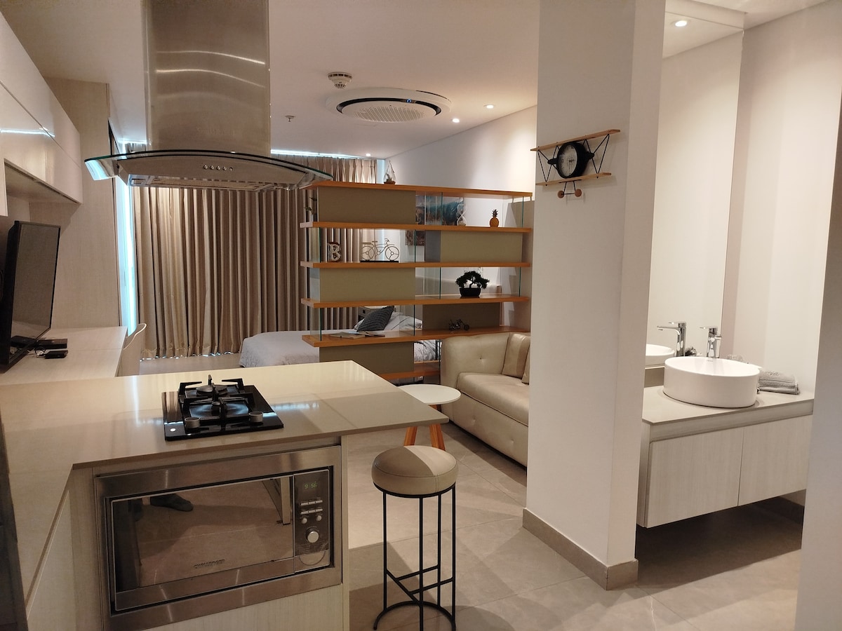 Your perfect stay for vacations or business! Enjoy this beautiful studio with Smart TV and workspace, ideal for relaxing or working comfortably. Located just 5 minutes from shopping malls, restaurants, banks, and transportation, in a building with: ✅ Hotel-style lobby and parking ✅ Coworking space, gym, and game room ✅ Terrace with a views, jacuzzi, and 24/7 security Additionally, enjoy our mini bar for an extra cost. Book now!