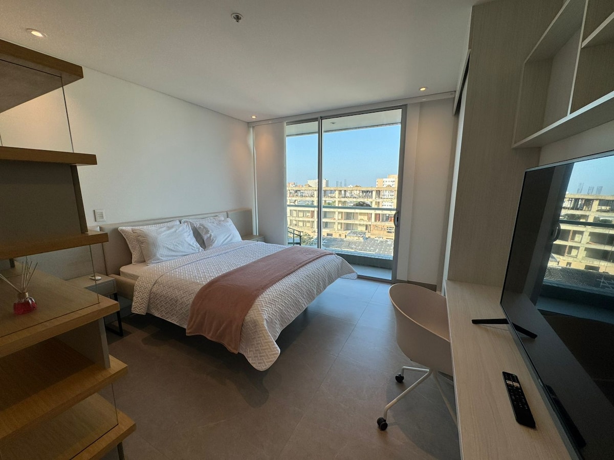 Disfruta de una experiencia inolvidable en este moderno apartaestudio tipo loft en el piso 9 de GZ Tower: * Check-in y Check-out flexible *WiFi 900 Megas *A 1 cuadra de la clínica Iberoamericana y a 3 cuadras del Viva Mall. *1 habitación con cama Queen y aire acondicionado. *Sala con sofá cama y aire acondicionado. * Lavadora-secadora *Gimnasio Smartfit cerca (de pago). *Estacionamiento privado gratuito. *Ubicación ideal: Cerca de centros comerciales, principales clínicas y zonas turísticas.