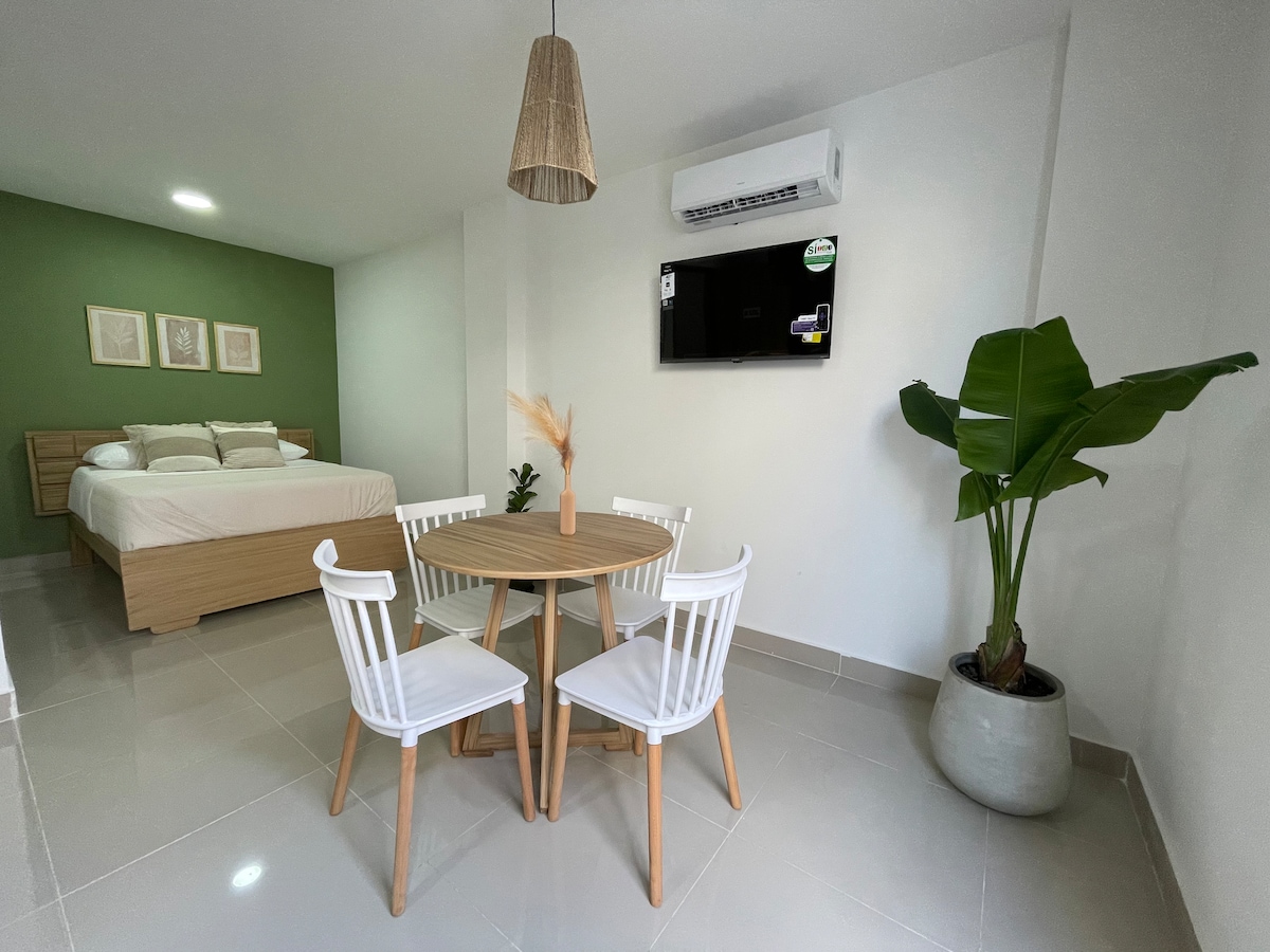Cómodo apartaestudio independiente de una habitación, con aire acondicionado, baño privado, cocina equipada, comedor y patio. Cuenta con Wifi, Smart TV, tv cable, escritorio, Lavadora y se encuentra totalmente amoblado. Ubicado en el sector más seguro de la ciudad, muy cerca a los mejores centros comerciales, restaurantes, supermercados, los nuevos centros empresariales y sitios de diversión, con un hermoso parque al lado y fácil acceso al transporte público.