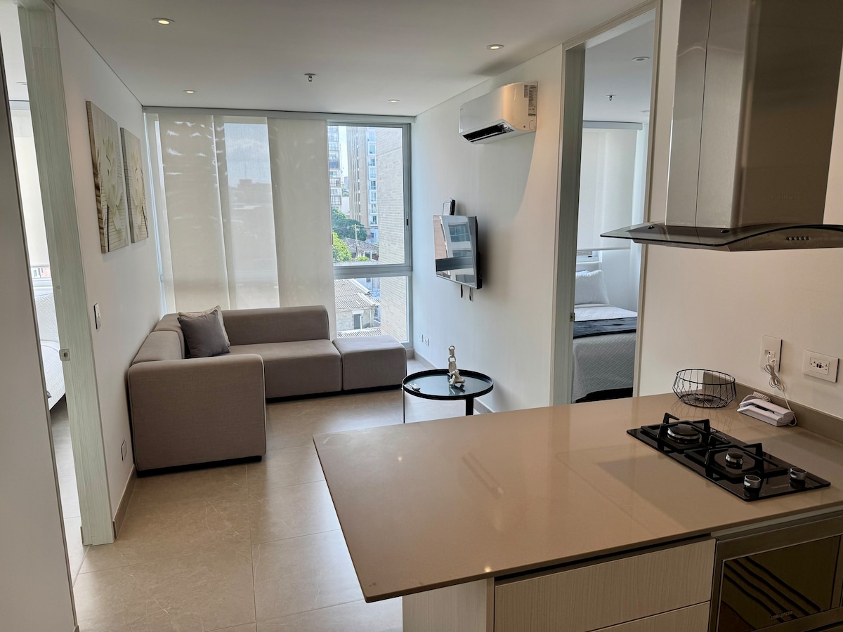Cómodo apartaestudio independiente de una habitación, con aire acondicionado, baño privado, cocina equipada, comedor y terraza. Cuenta con Wifi, Smart TV, tv cable, escritorio, Lavadora y se encuentra totalmente amoblado. Ubicado en el sector más seguro de la ciudad, muy cerca a los mejores centros comerciales, restaurantes, supermercados, los nuevos centros empresariales y sitios de diversión, con un hermoso parque al lado y fácil acceso al transporte público.