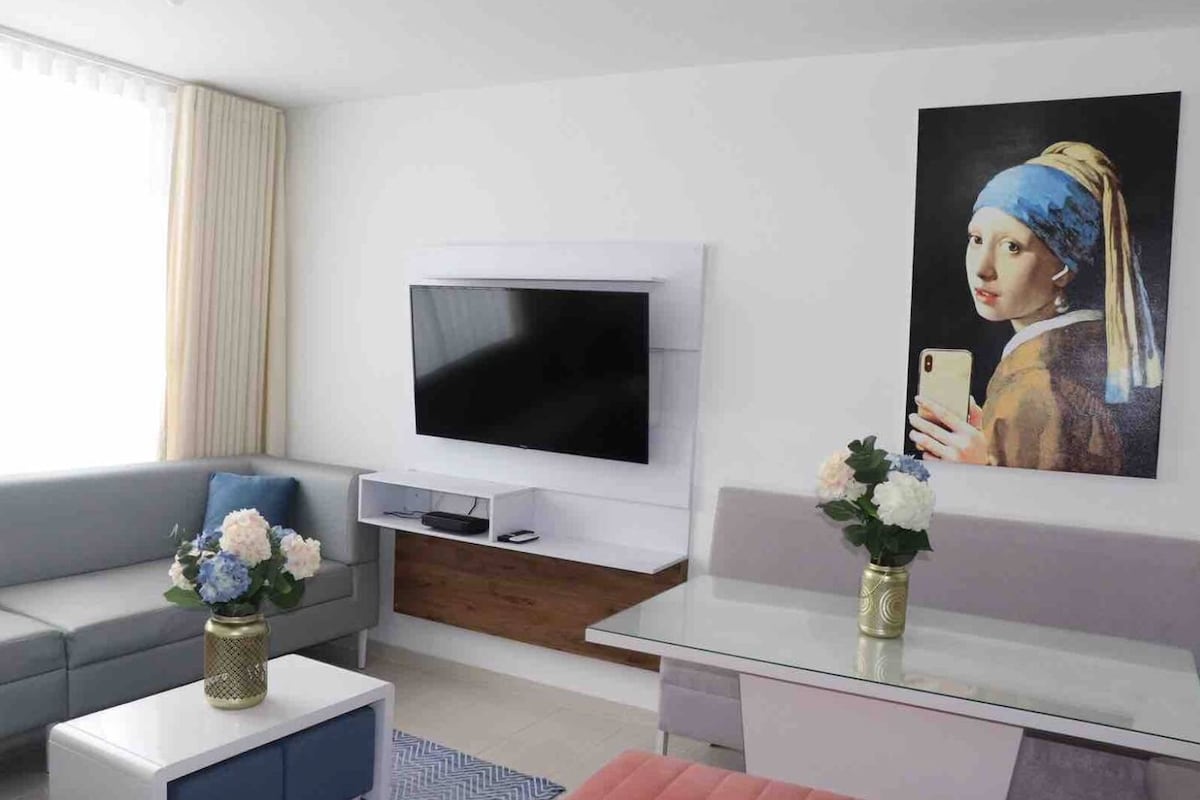 Moderno y acogedor apto en el norte de Barranquilla. Piso alto con ascensor y piscina (de jueves a domingo). Cerca de los centros comerciales Buenavista, Viva y Mallplaza. A solo 5 min de la Ventana al Mundo, el Gran Malecón y a 15 min de las playas de Puerto Mocho y Bocas de Ceniza, a 40 min de las playas de Salgar. Su ubicación estratégica ofrece fácil acceso por la Circunvalar, Vía 40, Cra 65A y Calle 96. Ideal para escapadas, viajes de trabajo o estancias prolongadas.