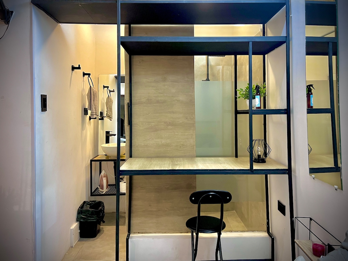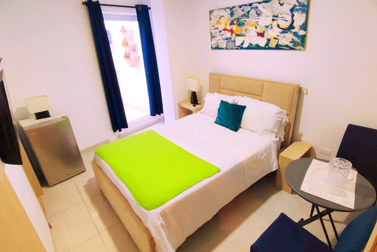 hospedaje boutique hermoso aparta estudio pequeño con baño, cocina privada, estufa, microondas, nevera minibar, licuadora dotado utensilios necesarios para buena estadía. Dentro habitación cama doble 2 personas aire acondicionado smart TV, wifi gratis edificio con área coworking, Gym estamos al norte barranquilla, tranquilo seguro, cerca parques para actividad física, cerca centros comerciales, restaurantes, farmacias y más distracción! interior no vista es interior , impecable, autónomo,