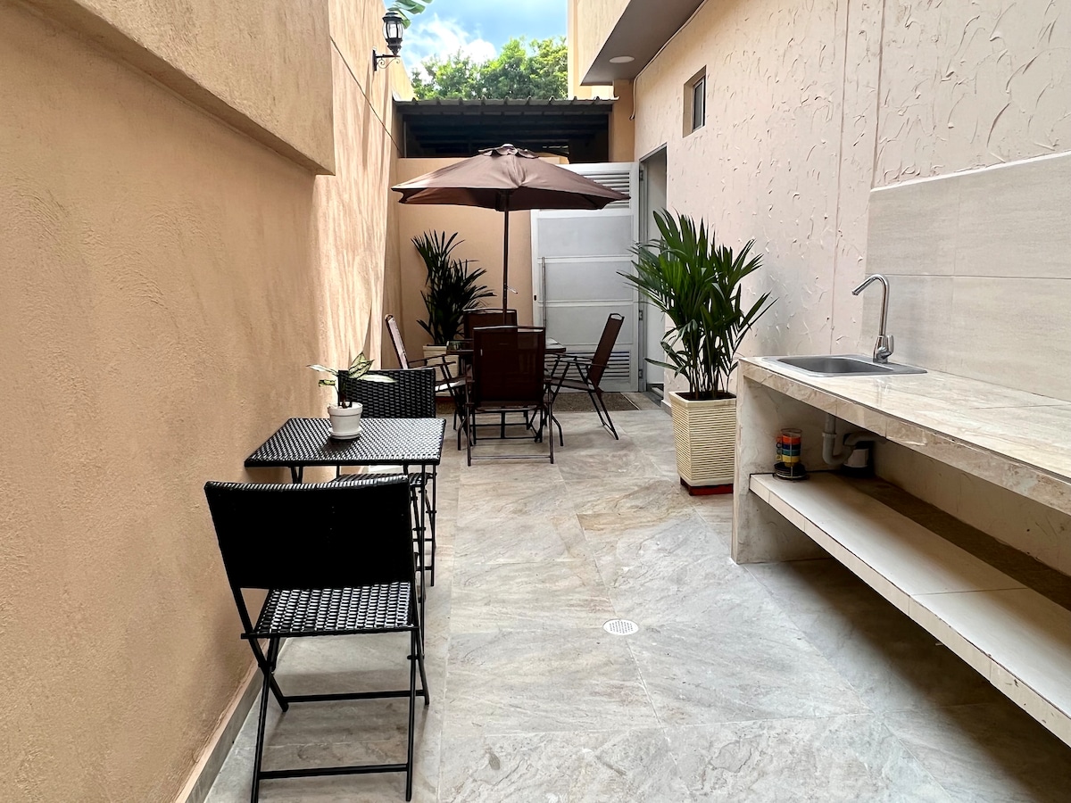 Disfruta de la sencillez de este alojamiento tranquilo y céntrico. Ubicado en un cuarto piso. Ofrece confort y tranquilidad, ubicado estratégicamente en el norte de la ciudad, frente de uno de los principales parques de la ciudad, restaurantes y supermercados. Cuenta con un colchón ortopédico tamaño queen, aire acondicionado, smart tv con base giratoria para que puedas ver tv desde la sala o desde el cuarto, cocina equipada lista para cocinar. EL AGUA DE LA DUCHA ES AL CLIMA.