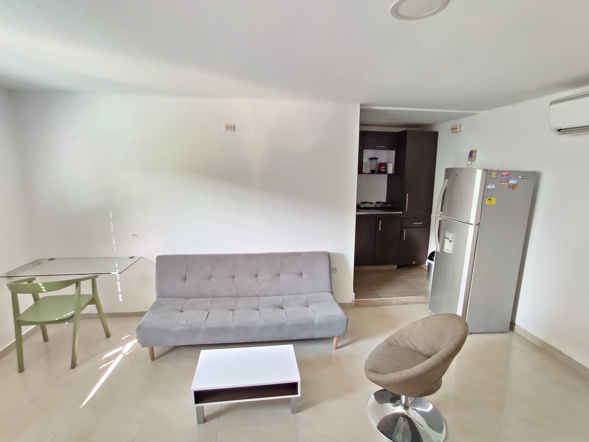 Disfruta de la sencillez de esta Suite de 35mt2 tranquila y cerca de universidades, supermercados, farmacias, centro comercial . El apto está dotado de 1 Sala, Barra de cocina con dos sillas para tomar tus alimentos, cocina, nevera, lavadora, cama Doble , aire acondicionado, internet y televisión por cable.