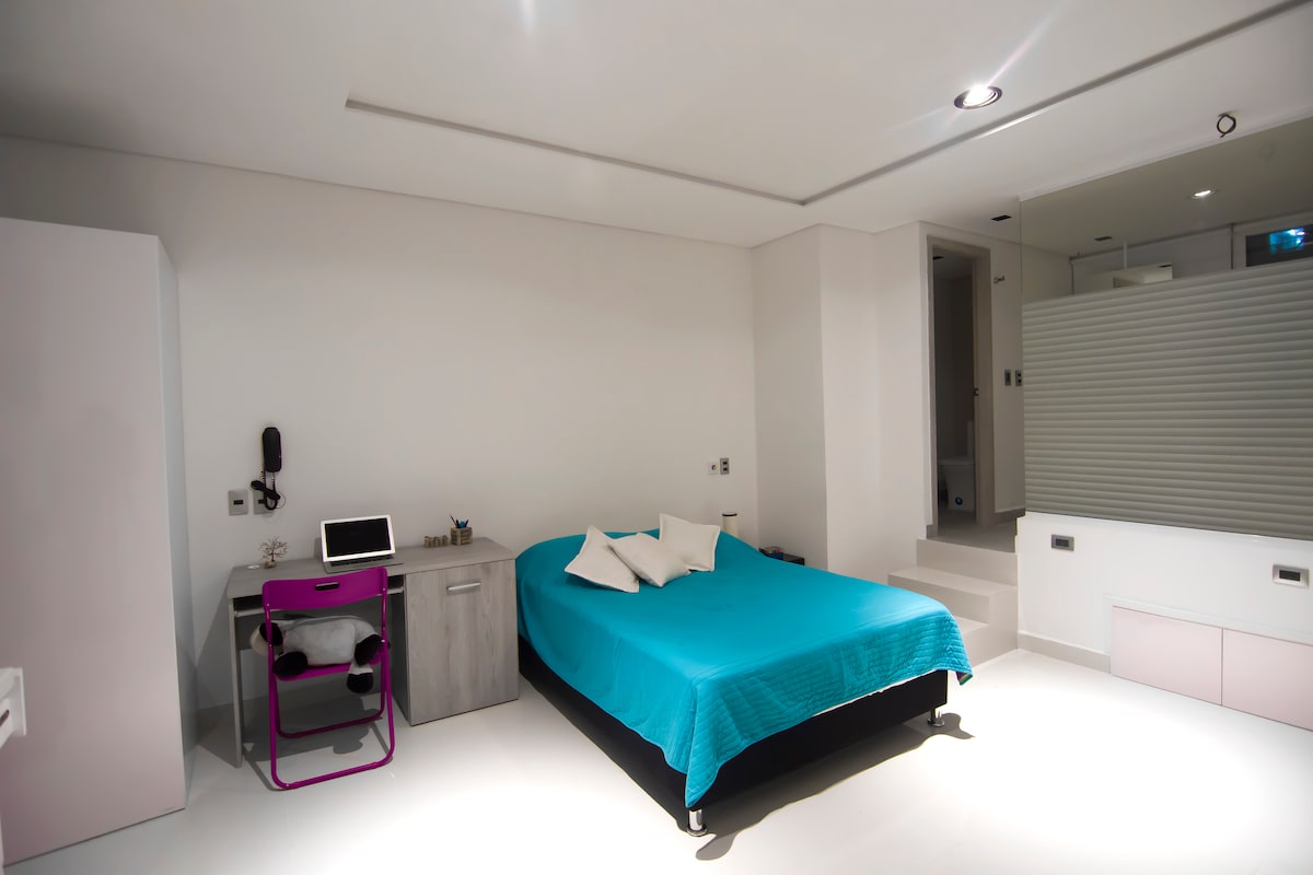 Hermoso apartaestudio, completamente independiente y completamente para el huesped, una cama doble, un sofacama, un baño, aire acondicionado, cocina completa y equipada, barra desayunadora, área de labores con lavadero, nevera, Internet, Televisor Smart, Tvcable, Netflix, Disney+, limpieza semanal gratuita para estancias largas si lo solicita.
