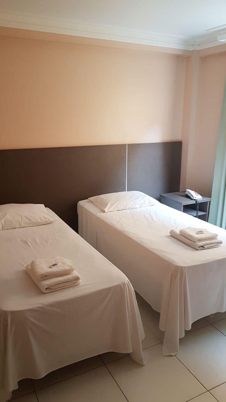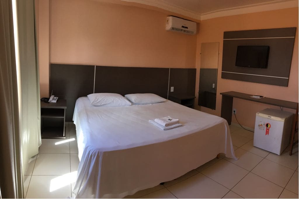O quarto conta com ar condicionado, cama casal, frigobar e banheiro privativo com chuveiro elétrico.
