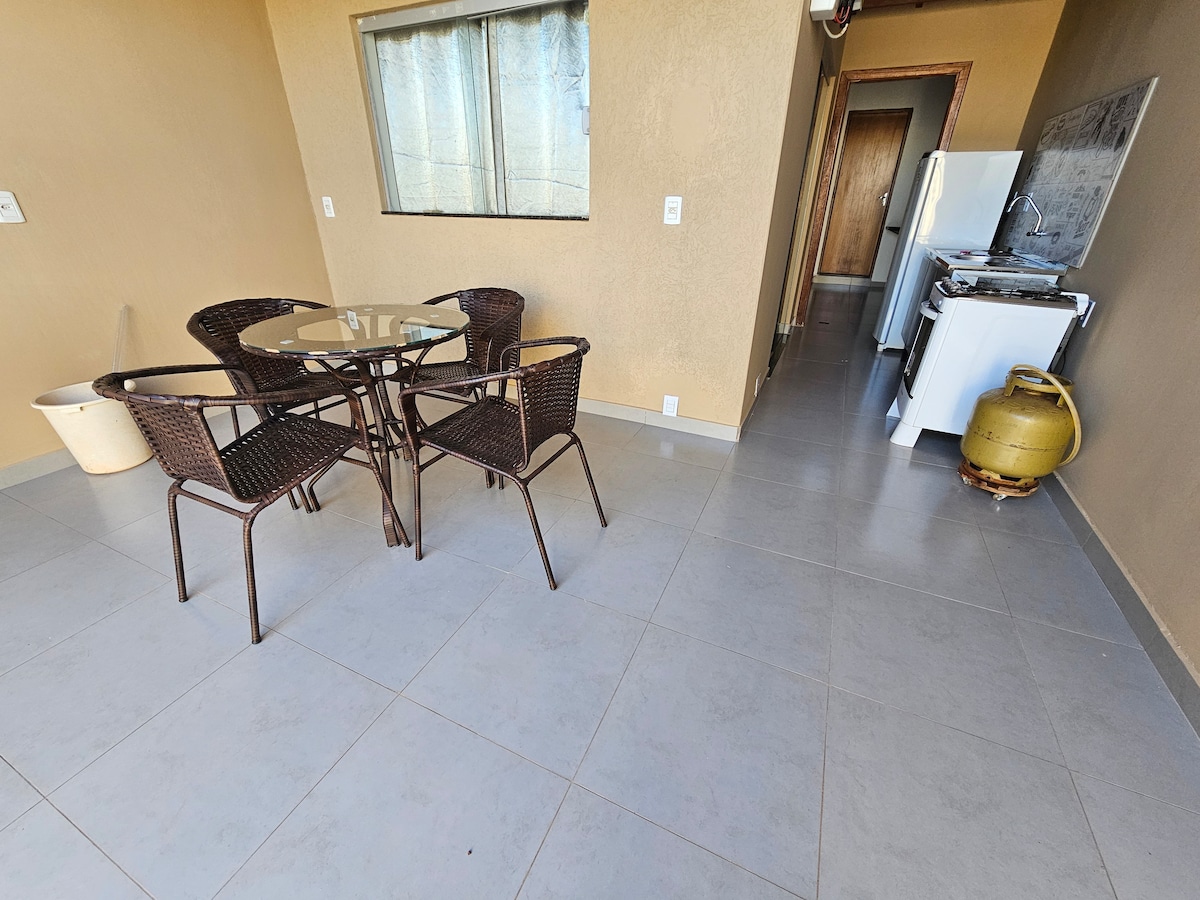 Abrace a simplicidade neste lugar tranquilo, novo e bem-localizado. Ideal para finais de semana, temporadas ou eventos. Edícula com total privacidade, com garagem para até 5 carros, 2 quartos com ventiladores, sendo 1 suite casal com banheiro privativo, 1 quarto solteiro para 6 pessoas, 2 banheiros externos com acessibilidade, churrasqueira, geladeira, freezer horizontal, cervejeira, cozinha completa com fogão elétrico, fogão a lenha e utensílios.