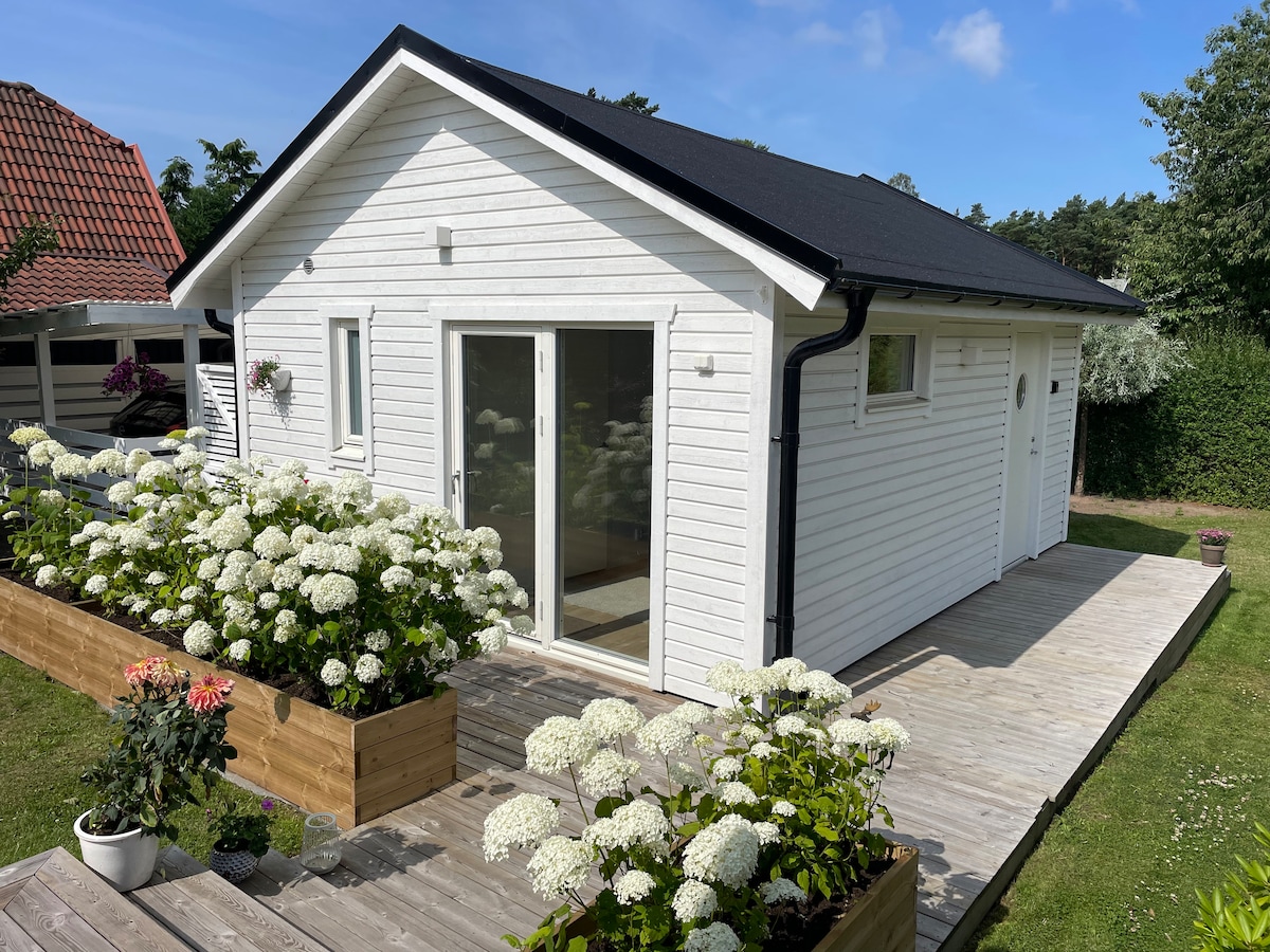 Mitt lilla hus är ett prisvärt övernattningsställe med idealiskt läge. Sväng av och hitta boendet på baksidan av mitt hus. Ett eget trädäck runt huset ger en fin uteplats och om du känner för att grilla så finns allt du behöver. Vad vill du besöka? Österlen? Köpenhamn? Lund? Malmö? Hven? Boendet ligger 800 m från tågstation, tio minuters promenad från golfbana och 250 m från ICA-affär med generösa öppettider. Helkaklat badrum med dusch o toalett, kylskåp och Micro finns naturligtvis .