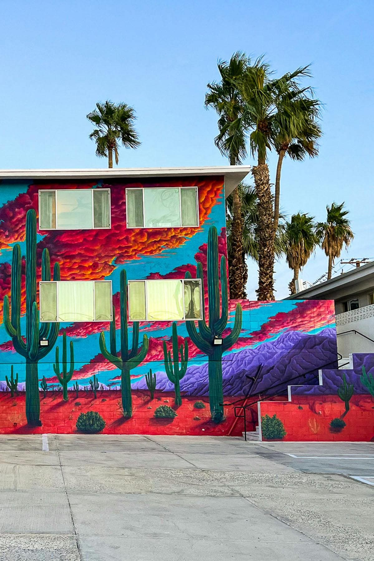 Room 2 is a cozy 140 sq ft / 13 m2 space featuring a queen bed, custom blankets and pillowcases, and original artwork. It also includes a writing desk and a view of the hotel sign, complimentary wi fi, a smart TV, snacks, closet, and a bath with shower complete with our signature 29 tile floor. A design led motel in the near Joshua Tree. Wake up with desert light pouring in, enjoy the best hikes then end the night with delicious food and cocktails at Kitchens Dessert.
