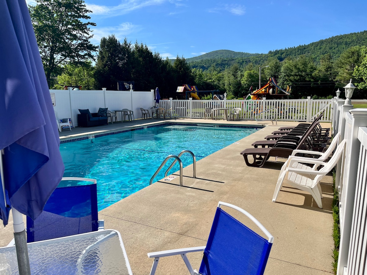 Our property offers peace and quiet compared to the noisy hustle and bustle of North Conway, so that you can relax and enjoy the mountain views, trees, and extensive lawn with a very nice inground pool, picnic tables, charcoal grills, and large playground. Whether you're here to explore the scenic hiking trails, visit StoryLand, or simply relax and rejuvenate, our secluded accommodation provides a comfortable and welcoming home base for your adventures.
