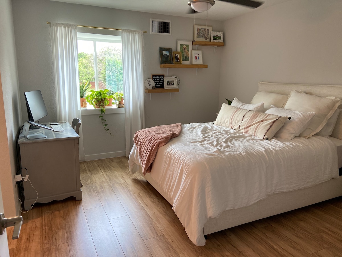 Perfect South Austin retreat just minutes away from the vibrant South Congress, trendy South Lamar, iconic Barton Springs, scenic Lady Bird Lake, and the heart of Downtown along with free parking. Inside, you'll find a spacious bedroom featuring a luxurious California king bed and ample closet storage. Large widows for natural light (curtains are on all windows for privacy) . For additional sleeping space, the cozy living room includes a convenient pullout queen bed from the comfortable couch.