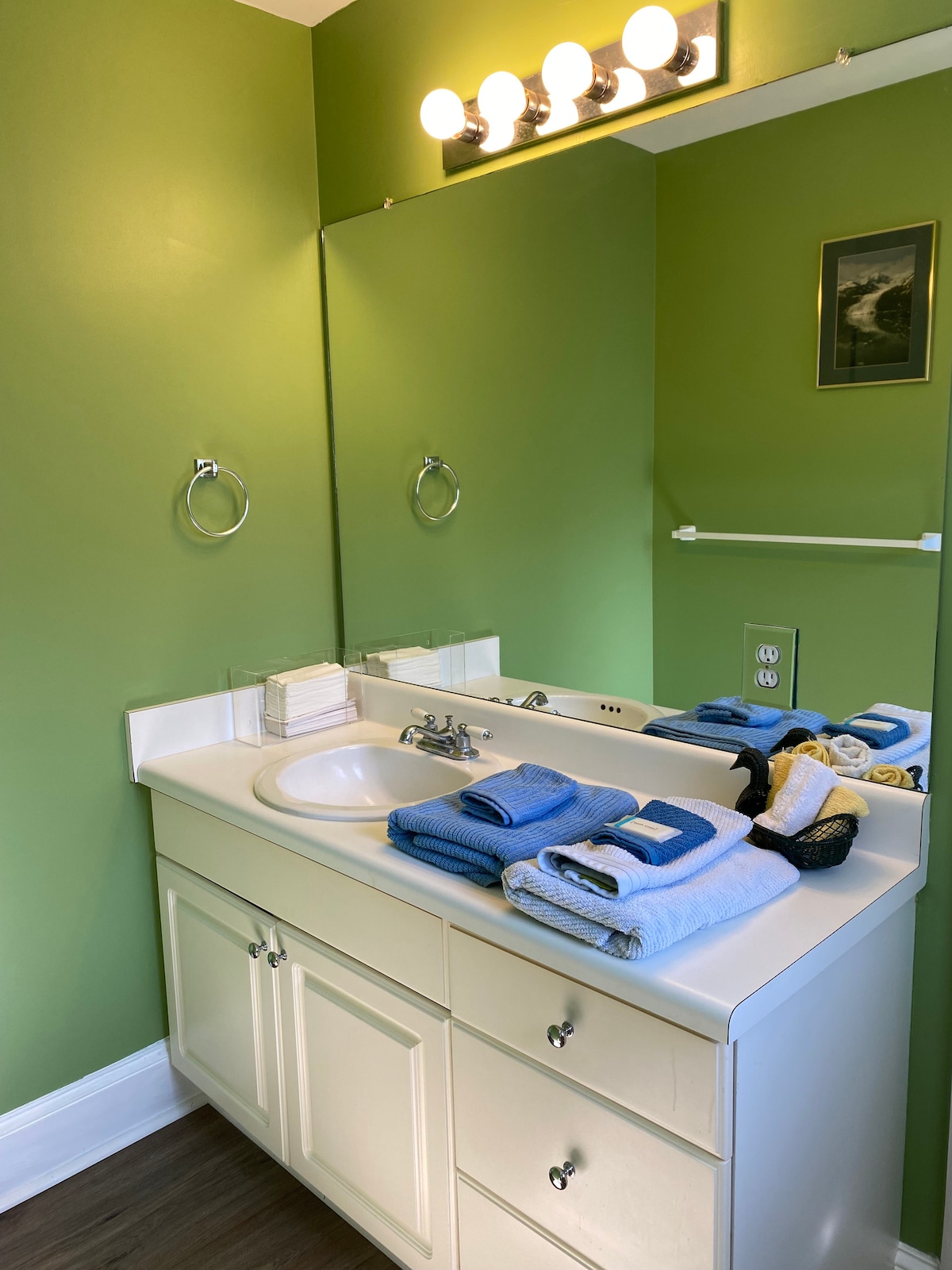 Super Quiet Room. Updated Summer of 2024. The beds are a daybed with super comfy pillow top mattress on top and a pull out bed with memory foam mattress on the bottom. The other bed is a twin XL Electric. You have your own private vanity & sink in suite. Roku TV with YouTube TV. Small Fridge with storage shelves. The closet is large if you need to store lots of items. You may share a tub/shower/toliet between your room and the “Masi Mara Room”.