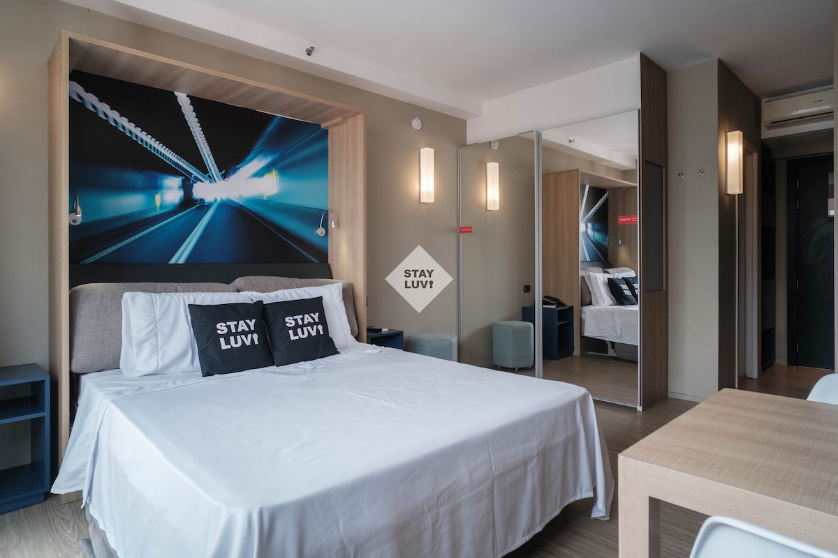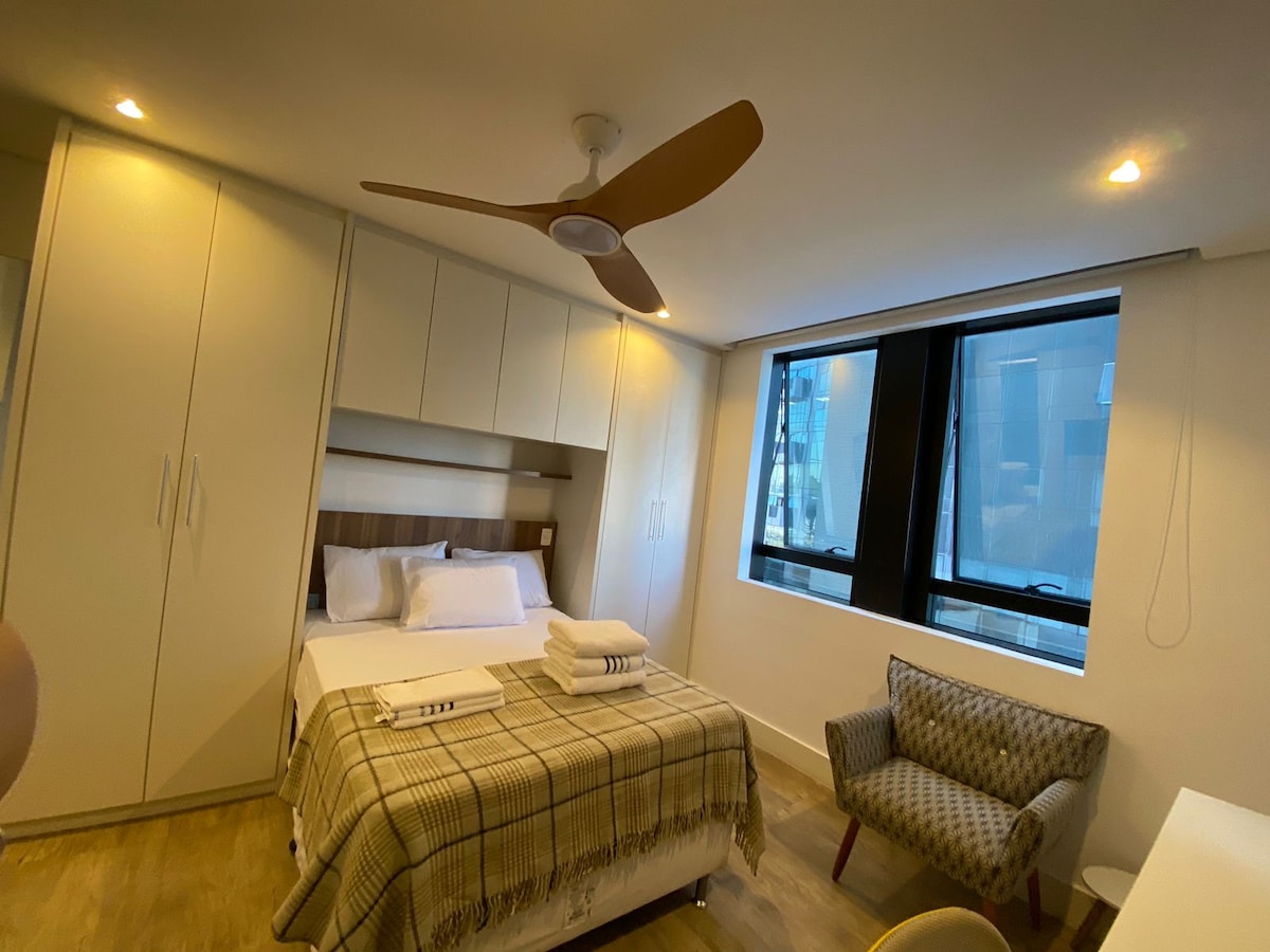 Studio com ótima localização, próximo a Alphaville e centro de Barueri, equipado com cama KING, internet wifi (VEL. DE 350 MB), cozinha compacta e smart TV. Perfeito para pessoas viajando sozinhas ou em mais pessoas tanto a lazer quanto trabalho. O condomínio conta com piscina, academia, lavanderia, além de um mini mercado. Próximo ao studio, tem um Minuto Pão de Açúcar, restaurantes, padaria, ginásio, farmácia e bares, tudo para um deslocamento sem veículo. Até breve