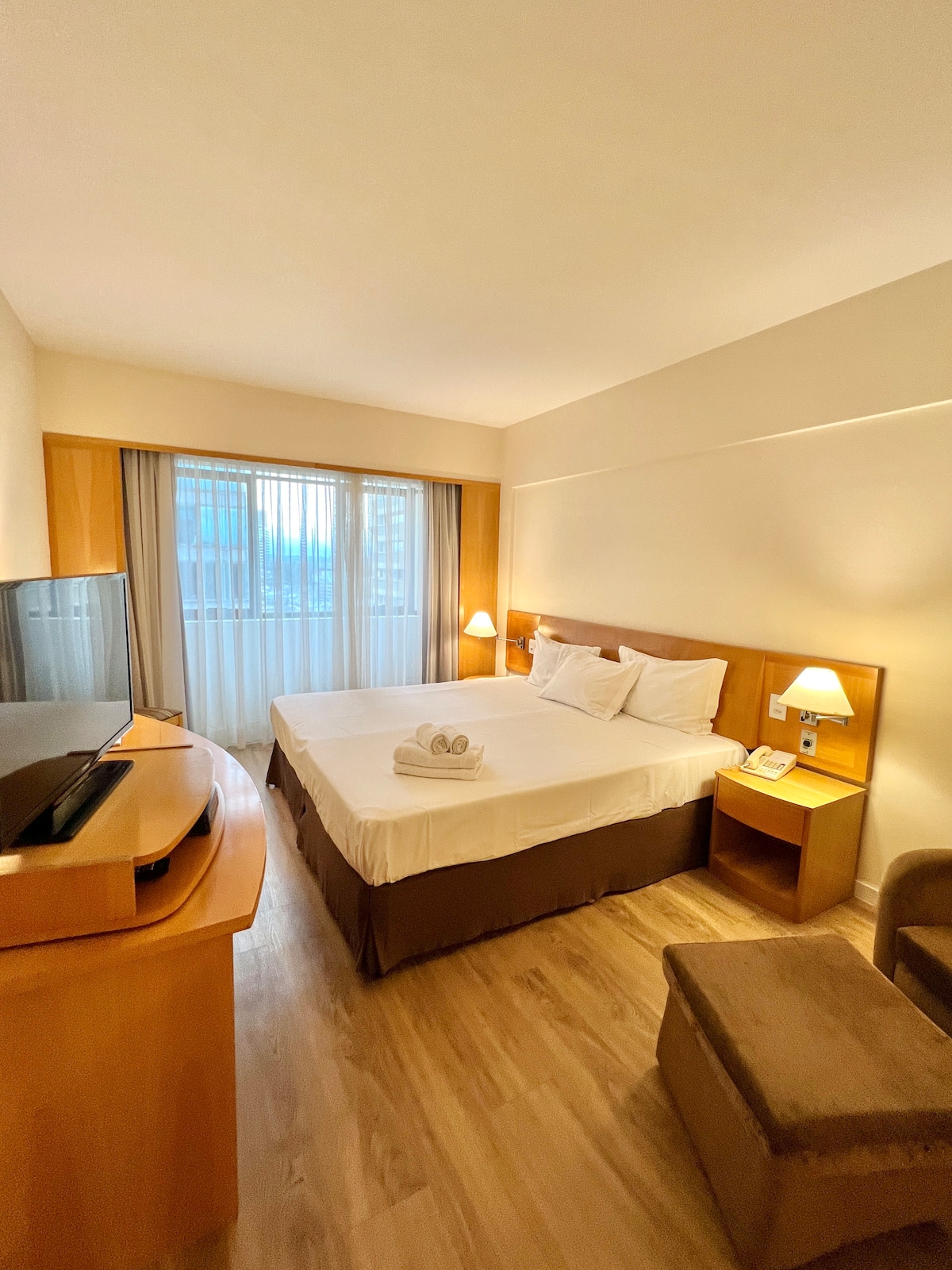 Apartamento aconchegante com excelente localização no centro de Alphaville! Próximo à padarias, mercados, shoppings, centro comercial, restaurantes, bancos, farmácias e hospitais. Localizado em rua silenciosa, segura e tranquila, o edifício conta com: Recepção 24h. Restaurante com café da manhã, almoço e jantar (consultar valores no restaurante). Academia. Piscina (no momento encontra-se em reforma). Entre outros… OBS: é possível separar as camas para 2 de solteiro.
