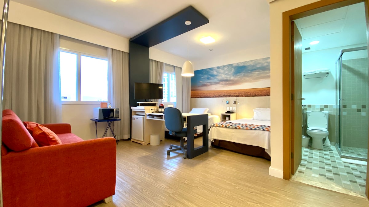 Modern service apartment at the heart of Alphaville with all the amenities that you will need for a comfortable stay! Included in your stay are the following services: daily cleaning (except for Sundays and national holidays), free usage of the swimming pool, tennis court, gym, 24 hours reception desk. In the building, for an extra cost, there are a couple of restaurants and laundry service. Within walking distance there are 3 malls, 2 supermarkets, a bakery and public transportation.
