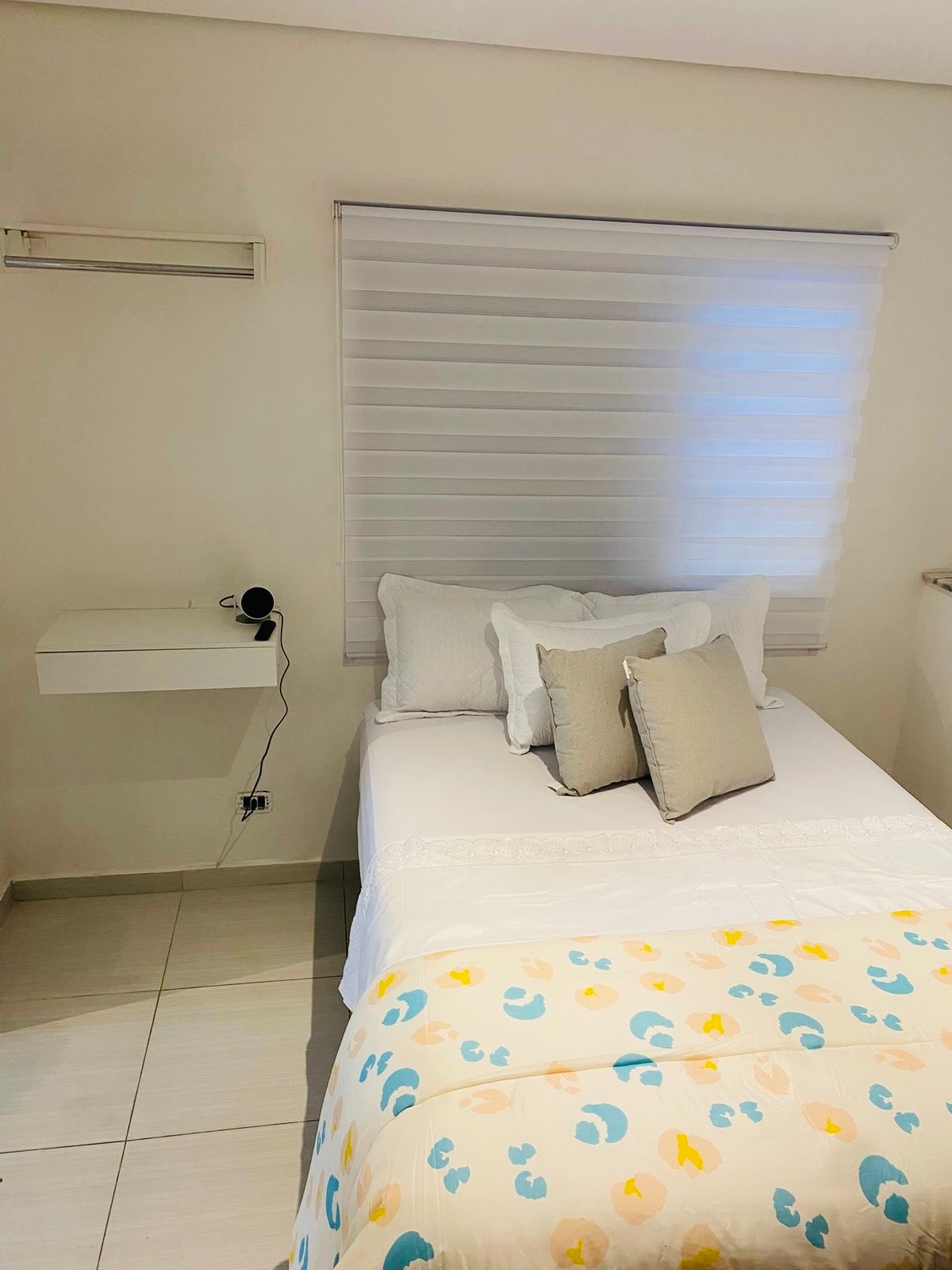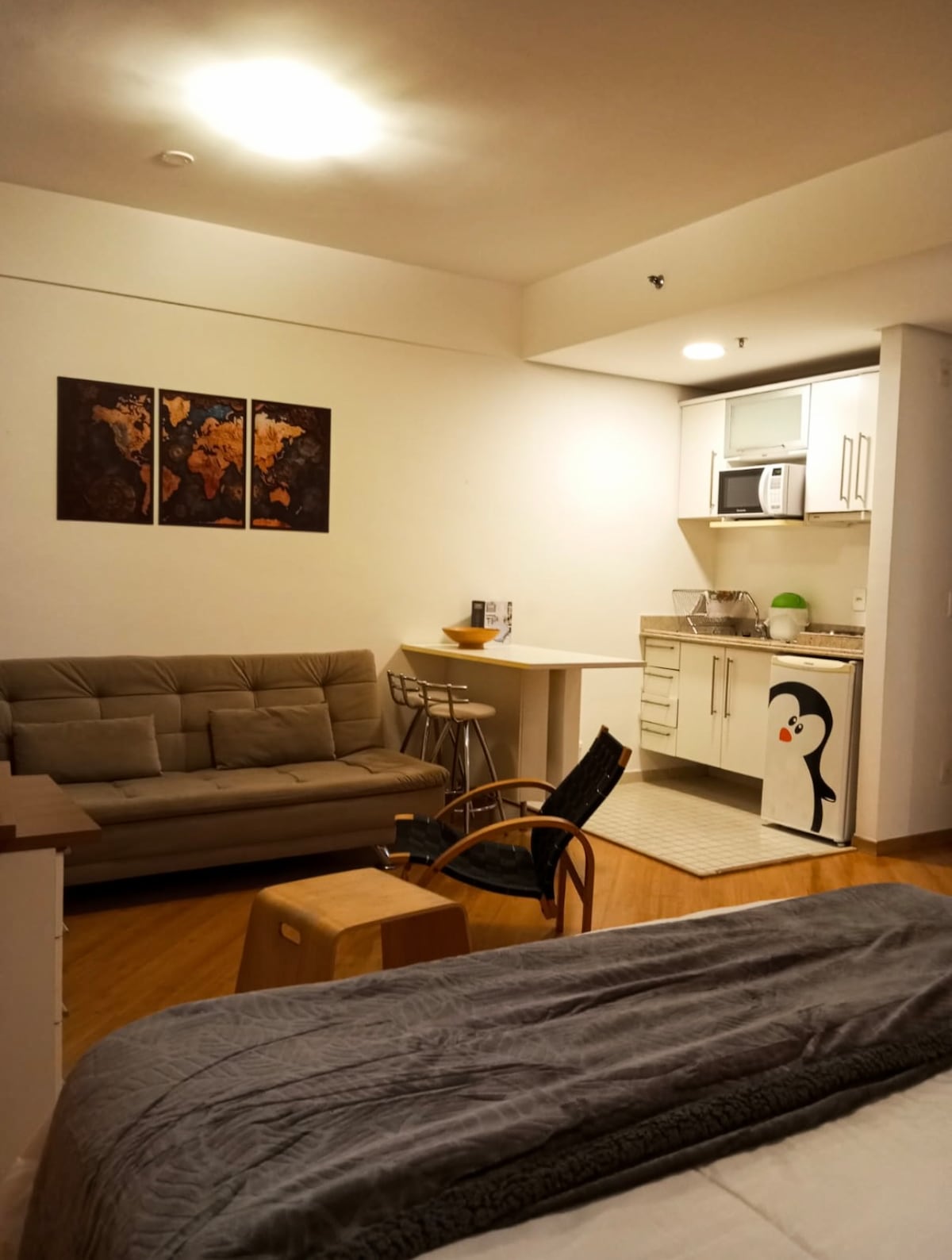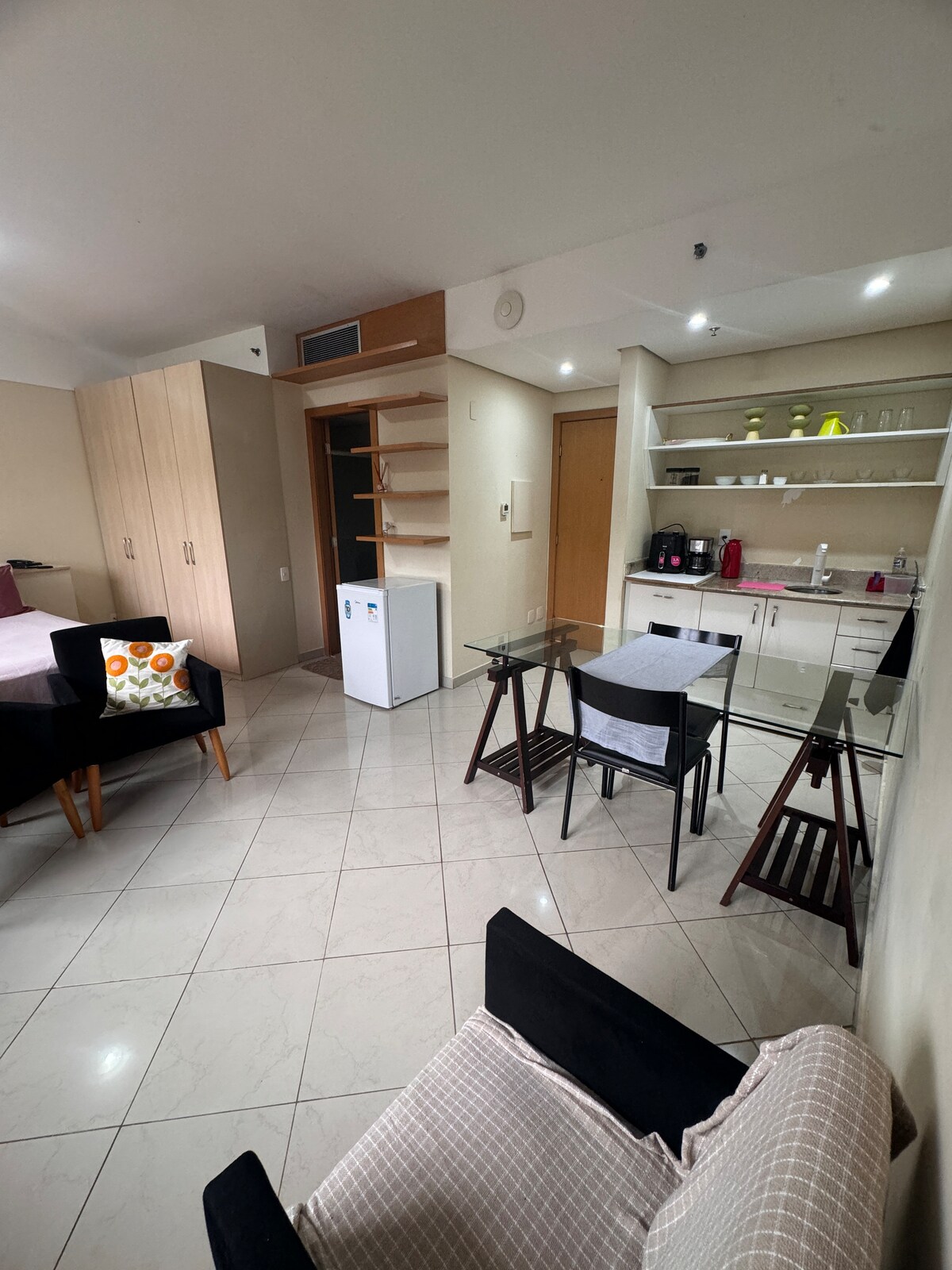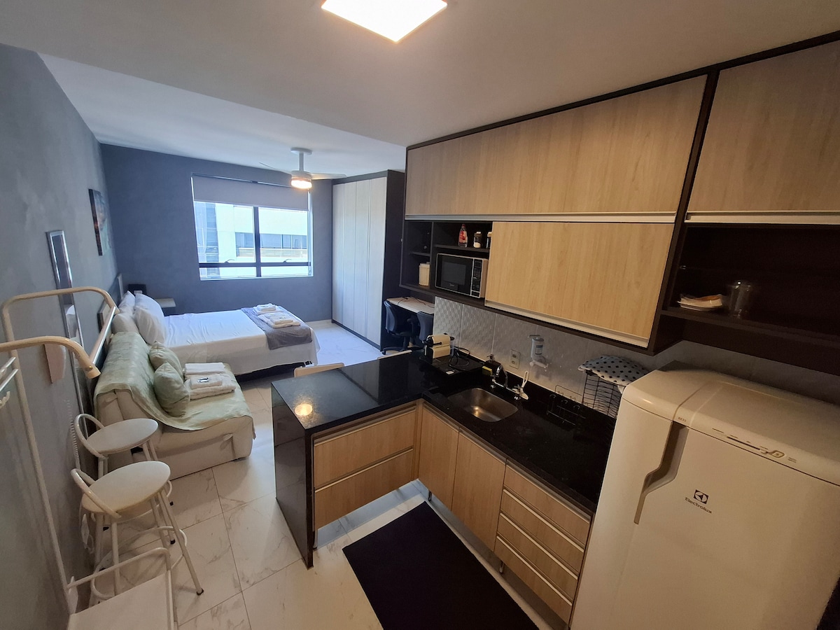 Ponto central em Alphaville. Até 4 hóspedes. Wifi e TV a Cabo. Ar condicionado. Quarto com cama de casal que pode ser transformada em duas de solteiro. Na sala, há um sofá-cama onde cabem dois adultos, além de mesa de trabalho. Banheiro com ducha. Cozinha com fogão, micro-ondas, geladeira, panelas, pratos, etc. Restaurante (pagamento é feito à parte). Uma vaga na garagem com manobrista. Prédio tem máquina de levar e secar. Fica defronte ao centro comercial Alphaville.