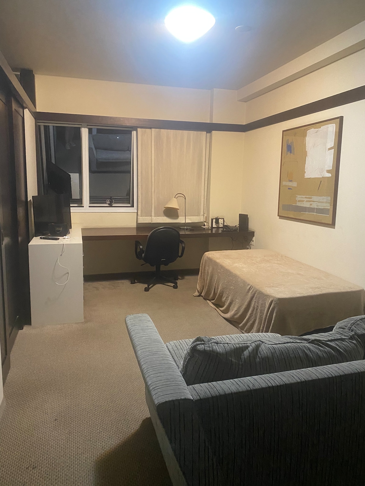 Flat completo no coração de Alphaville, ideal para trabalho ou descanso. Ambiente moderno e aconchegante, com cama queen, TV, ar-condicionado e mesa de trabalho. Cozinha americana equipada com cooktop, micro-ondas e frigobar. Banheiro amplo com bancada em mármore e box de vidro. Inclui garagem coberta e Wi-Fi. Localização privilegiada, próxima aos principais centros de eventos, shoppings e restaurantes da região.
