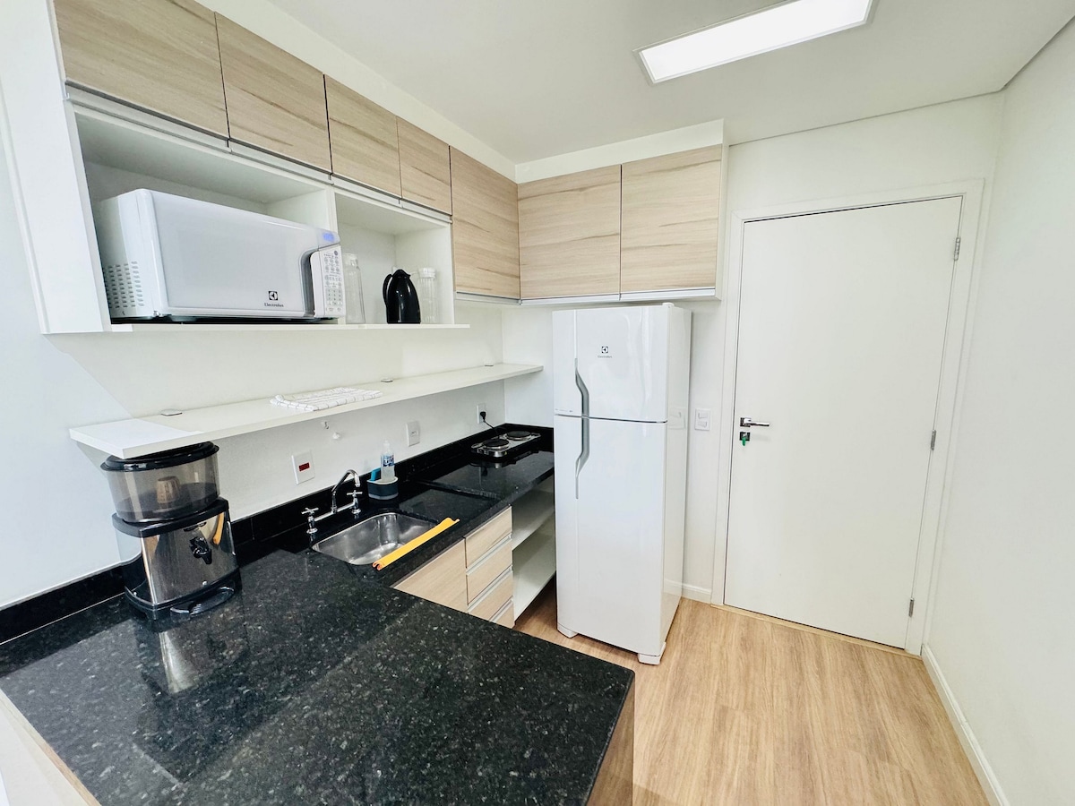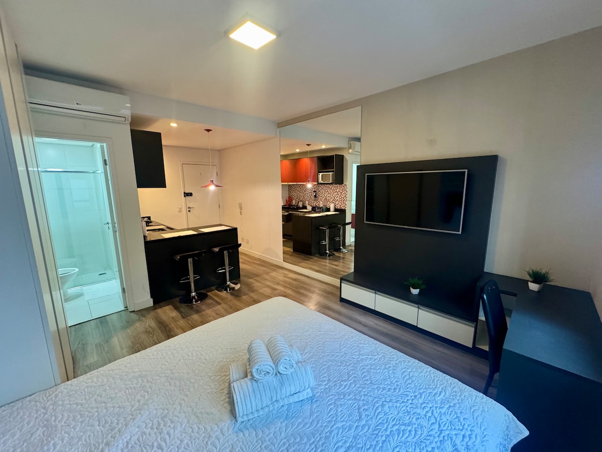 Studio completo, ideal para quem busca conforto e praticidade. Equipado com ar-condicionado, frigobar e uma vaga coberta na garagem, é perfeito para estadias curtas ou longas. Ambiente aconchegante, bem iluminado, ideal tanto para trabalhar quanto para relaxar com conforto. Localização estratégica, com fácil acesso a comércios e vias de acesso. Um espaço privativo e tranquilo, feito para você se sentir em casa!