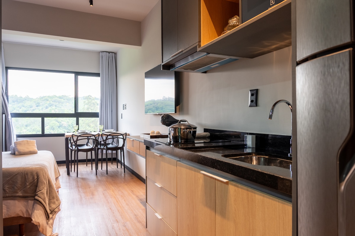 New flat! Modern and Cozy Professional hotel service. 200 meters from the José Correa Gymnasium. Restaurants, open mall, markets and shops nearby 3 km from Alphaville Kitchen equipped with crockery, pans, cutlery, microwave, minibar, grill, induction stove and Nespresso coffee maker. Excellent quality bed and bath linen. New queen bed, 200 thread count sheets with a satin touch, goose down and Nasa pillows. Parking space and 300Mbps wifi included.