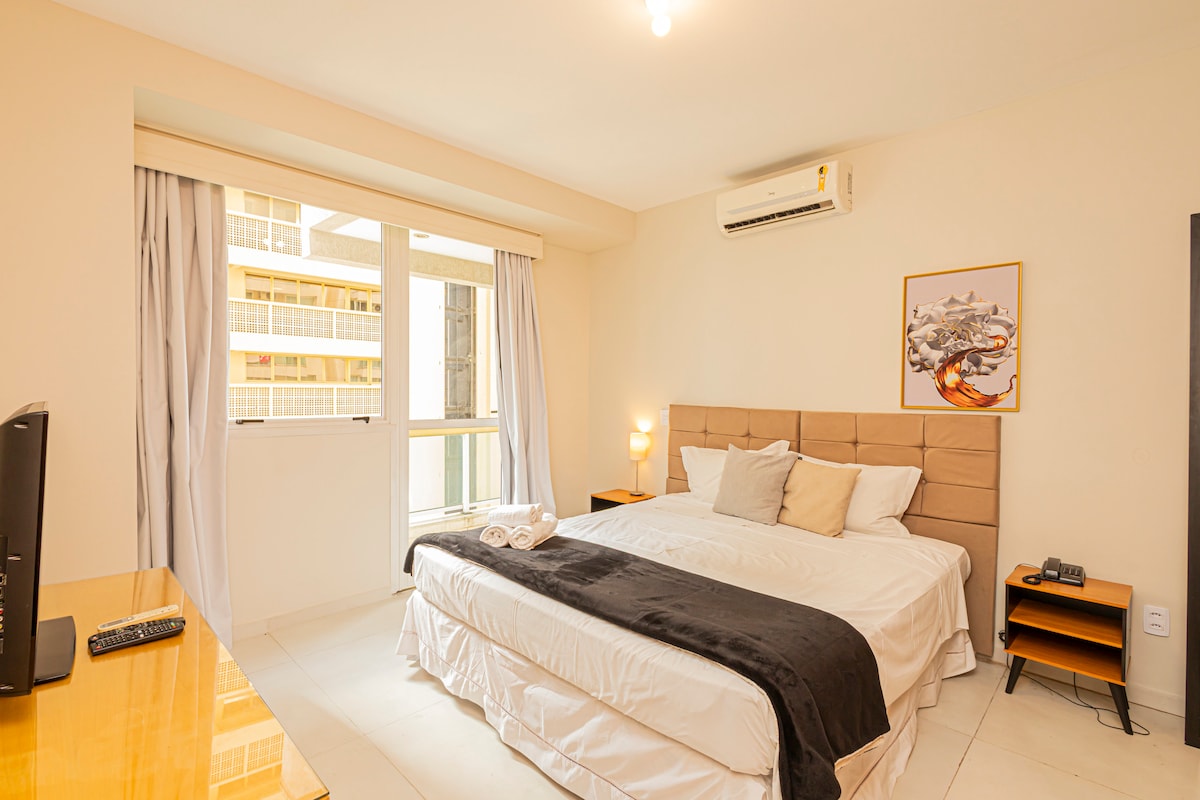 Flat recently renovated (2022) in the center of Alphaville, with King Size bed, 55 inch TV, exclusive WiFi, full kitchen, workspace, super pleasant atmosphere. Kitchen equipped with dishes, glasses, cutlery, pans, microwave, stove, Nespresso. Swimming pool, sauna and fitness center available. Note: A bed and bath linen kit will be provided for each reservation, however we do not exchange or do room cleaning during the stay.