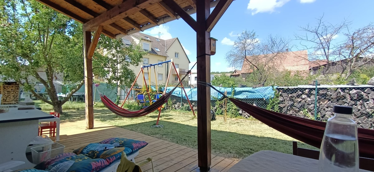 150 m² conçus par une famille de menuisiers alsaciens — poutres, escalier central, hauteurs généreuses. Mais ce qui reste dans les mémoires, c'est autre chose : la yourte au fond du jardin, le brasero qui rougeoie le soir, et cette sensation d'être à la fois nulle part et à 30 minutes de Strasbourg. Six personnes. Trois chambres Queen. Un jardin pour les enfants. Une yourte pour les adultes. Et une table de ping-pong pour régler les comptes.