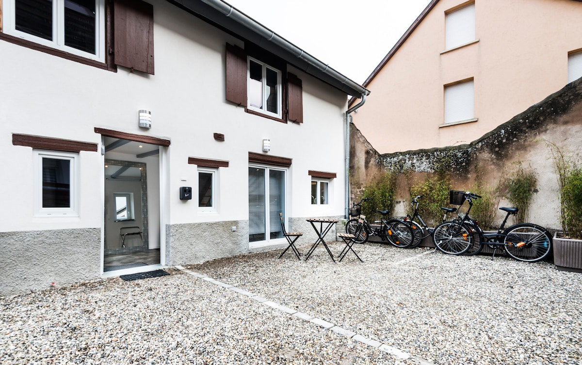 NOUVEAU, TRAM À 2km du logement ( Wolfisheim ) dès décembre 2025, avec un parking voiture relais tram. Accès en 5min avec les vélos mis à disposition. Studio indépendant tout équipé très calme, bien situé dans une résidence aux lignes alsaciennes ( boite à clés, climatisation, terrasse et cours partagées avec les propriétaires, pas de place de parking privée mais des places gratuites disponibles dans le village à moins de 50m). Proche Zénith, Aéroport, Route des vins, Strasbourg vélos 20min