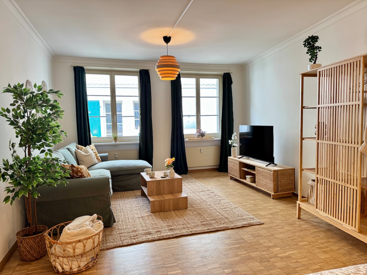Make yourself at home in this charming apartment in the heart of Basel City immediately next to the famous Rhine River. The vintage apartment stands out with its modern design and an amazingly unique patio with a wonderful view over the Rhine River. The historic City Center is only a few steps away. →70 qm vintage apartment →Central location →Bedroom, living and dining room, bathroom →Large and comfortable patio →2 comfortable sofa beds →Fully equipped kitchenette →NESPRESSO coffee