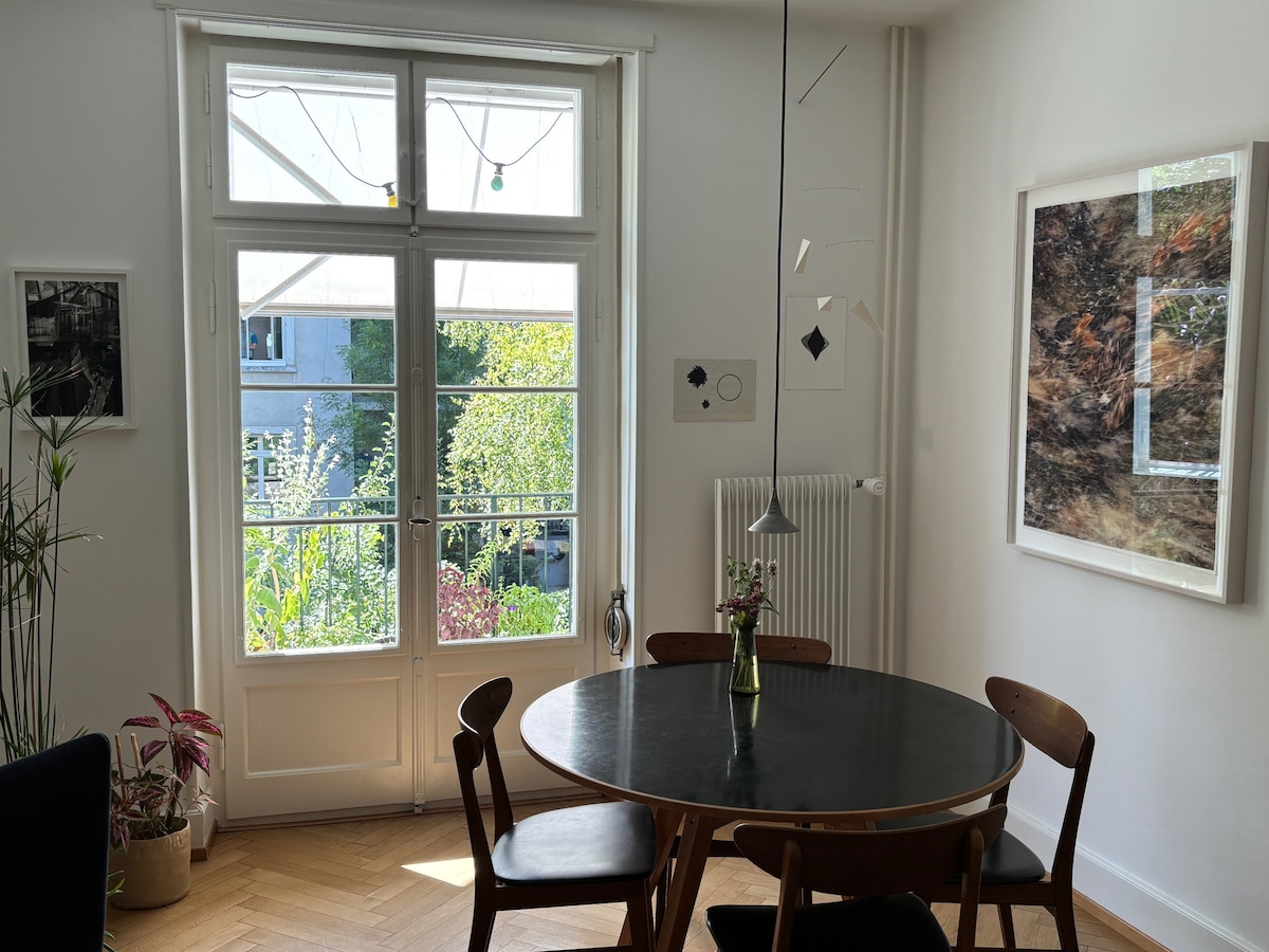 Die schöne Altbau-Wohnung hat viel charm, ist ruhig und gleichwohl super gut erschlossen; direkte Trammlinien zum Messeareal, zum Hauptbahnhof und zum Flughafen. Zu Fuss ist man in 10 Minuten im Stadtzentrum, hat einen grossen idyllischen Park um's Eck. Insbesondere in den warmen Jahreszeiten ist der private Innenhof der perfekte Ort zum ausruhen, arbeiten oder auch gemütlich zu essen. Die Wohnung hat zwei Schlafzimmer und ein Wohnzimmer mit einem Sofa. Die Küche und das Bad ist modern.