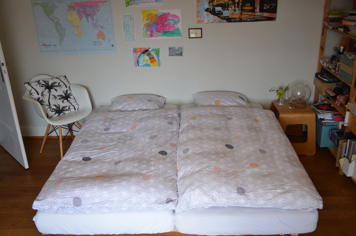 The attic is on the 4th floor (without elevator) of a charming old house in the hip Gundeldinger Quarter and is well connected by public transport. Nearby there are a few cafes, restaurants, supermarkets etc. The newly renovated object has a bathroom with shower and a double bed which can be divided into two singles. There is also a coffee machine and a refrigerator. - train station 2 min. (tram), 5 min. (by foot) - exhibition square 10 min. (tram) - city centre 8 min. (tram), 15 min. (by foot)