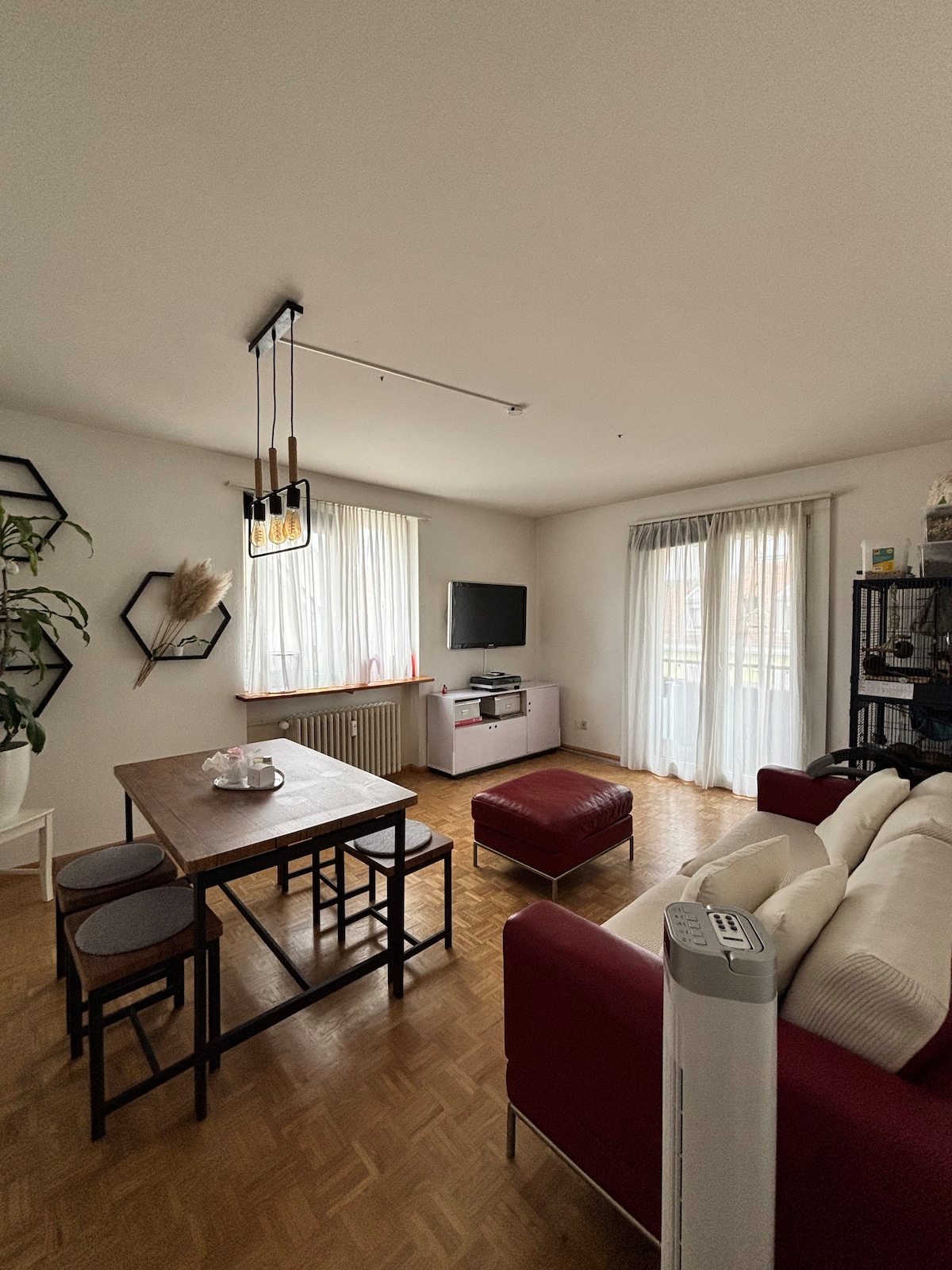 The apartment is on the 1st floor of a lovingly renovated house with a garden, near the city limits of Basel. It lies 9 minutes by tram from the SBB train station and right across from the idyllic recreation area Grün 80. The apartment is flooded with light and airy. In addition to the bedroom, there is a living room with a sofa bed , a workspace and a chill corner, as well as a bathroom with a bathtub and a fully equipped kitchen.