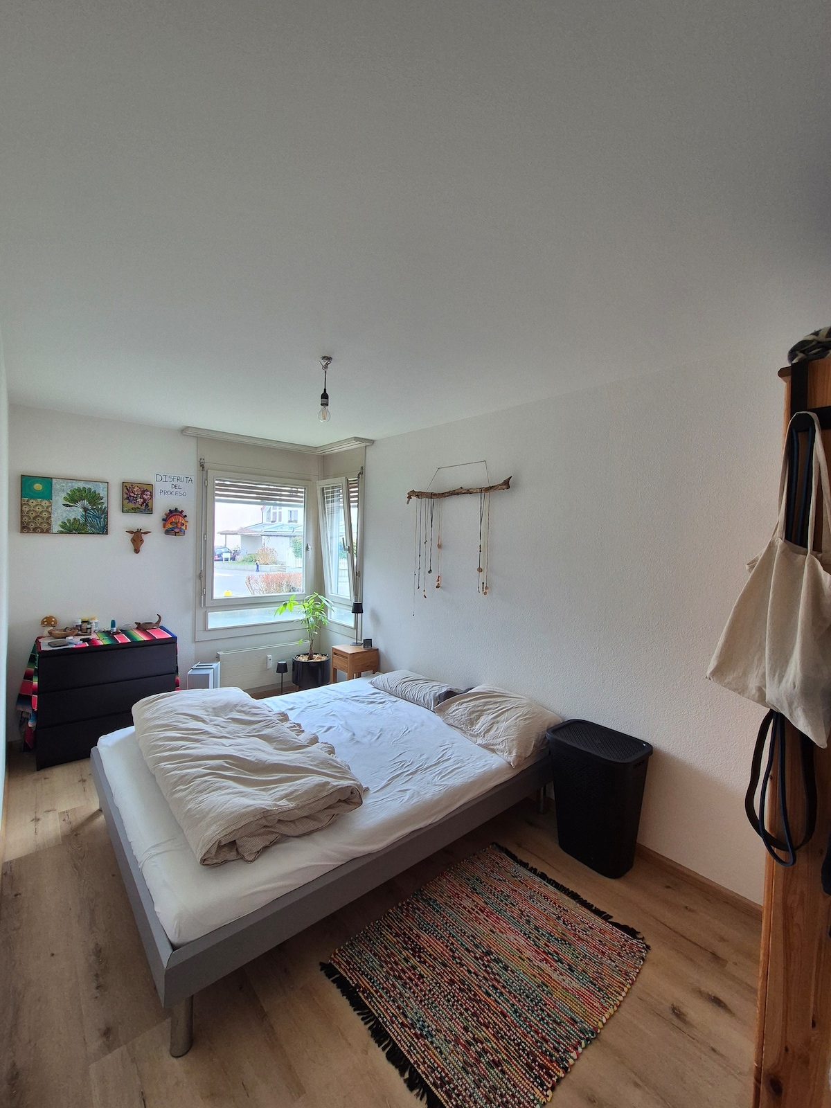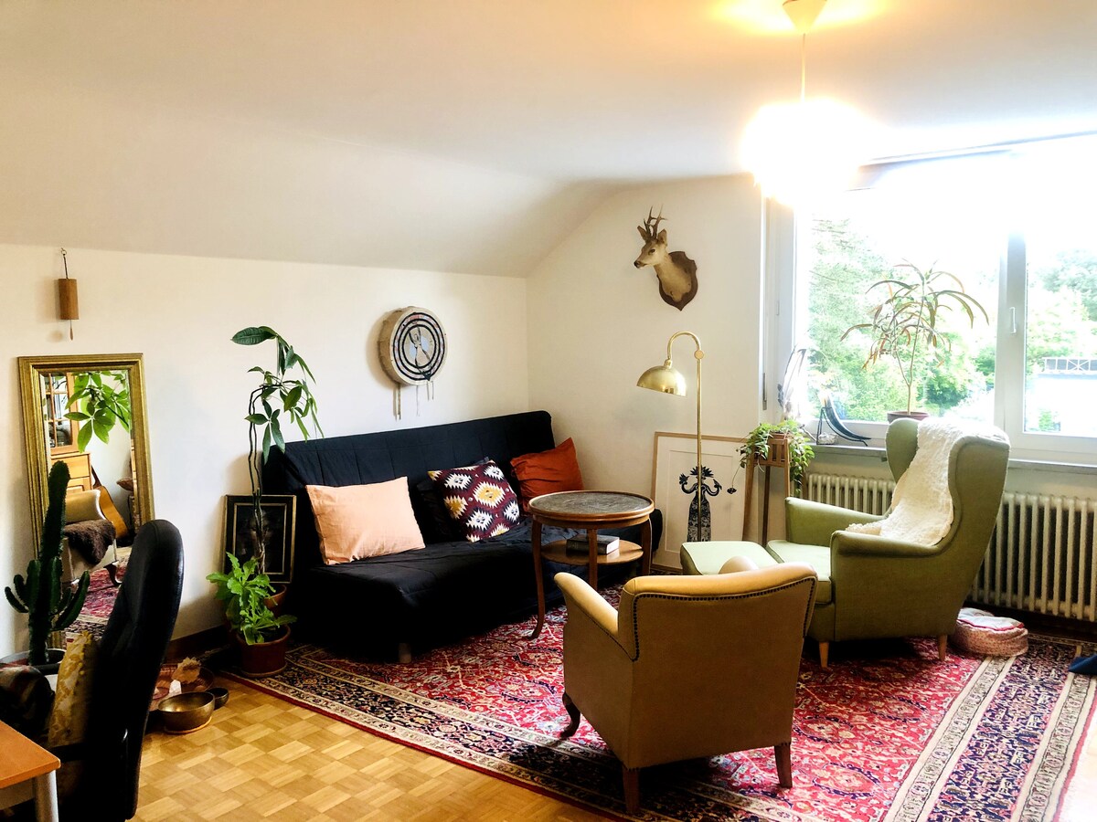 Stilvolle, lichtdurchflutete Altbauwohnung im Herzen von Basel – nur 1 Minute vom Rhein entfernt. Hohe Decken, warme Morgensonne bis in den Nachmittag und ein Balkon mit Blick ins Grüne schaffen eine ruhige Oase mitten in der Stadt. Perfekt gelegen mit direkter ÖV-Anbindung (Tram 11, Bus 30 und mehr) – ideal für Art Basel, Eurovision oder entspannte Citytrips. Küche & Bad mit Warmwasserboiler, eigene Waschmaschine. Ein Zimmer bleibt privat.