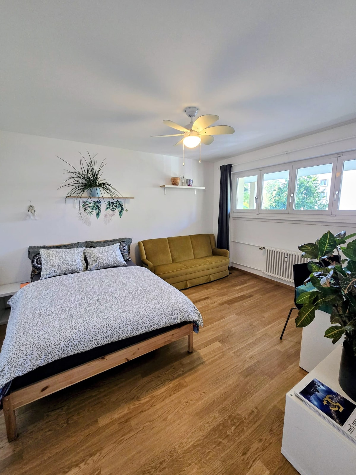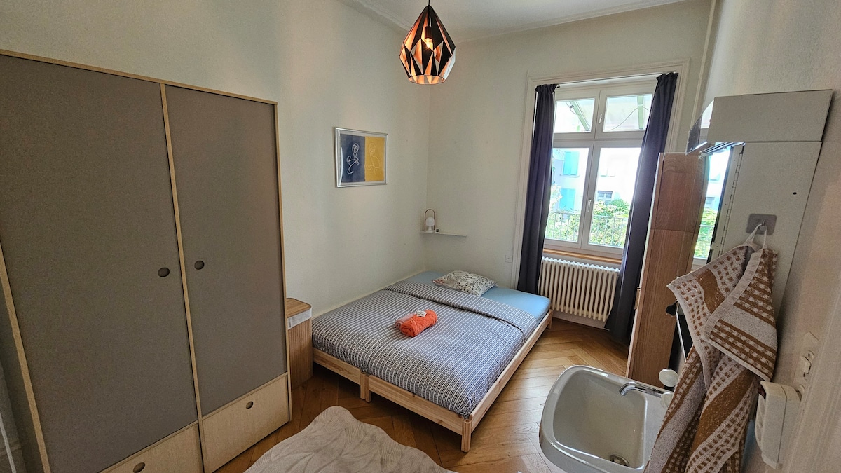 Newly renovated spacious 1 bedroom apartment with quiet balcony facing the garden. The apartment is located 100m away from the Rhine, on the Gross-Basel district. Large living, bathroom with washing machine/dryer, spacious bedroom and a balcony. Full kitchen amenities; towels, pillows, blankets, sheets, clean linen etc.; ironing plan and iron, TV (Smart TV, but no cable TV), fast WiFi, sofa-bed, extra mattress.