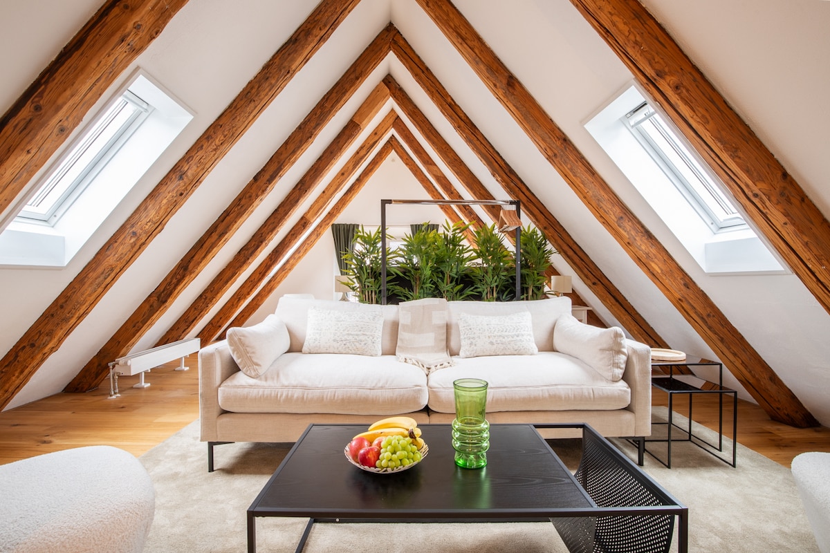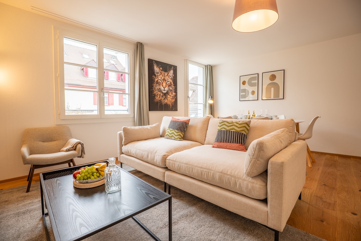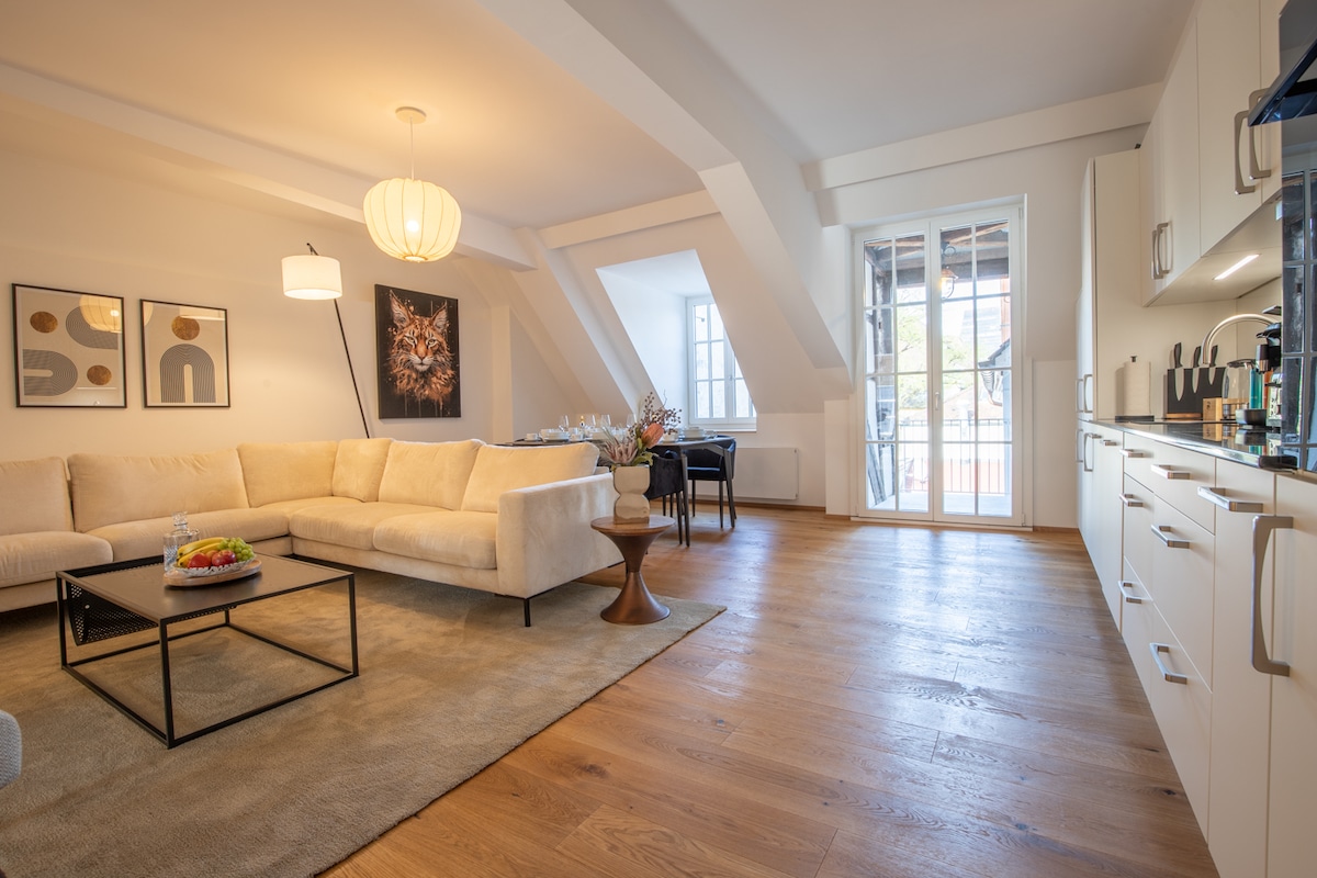 Make yourself at home in this charming apartment in the heart of Basel City immediately next to the famous Rhine River. The vintage apartment stands out with its modern design and an amazingly unique patio with a wonderful view over the Rhine River. The historic City Center is only a few steps away. →70 qm vintage apartment →Central location →Bedroom, living and dining room, bathroom →Large and comfortable patio →2 comfortable sofa beds →Fully equipped kitchenette →NESPRESSO coffee