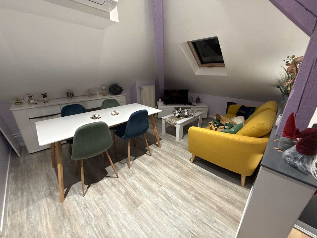 Nous vous proposons de séjourner dans un jolie appartement en duplex, classé deux étoiles, situé dans une ancienne grange, le tout dans un charmant petit village alsacien au calme. Vous serez idéalement situé pour visiter notre région. Mulhouse se trouve à 5 min en voiture, Belfort 20 min et Colmar et la route des vins à 25 min. A quelques mètres du logement vous pourrez trouver une boulangerie et un restaurant. A bientôt et au plaisir de vous faire découvrir notre région.