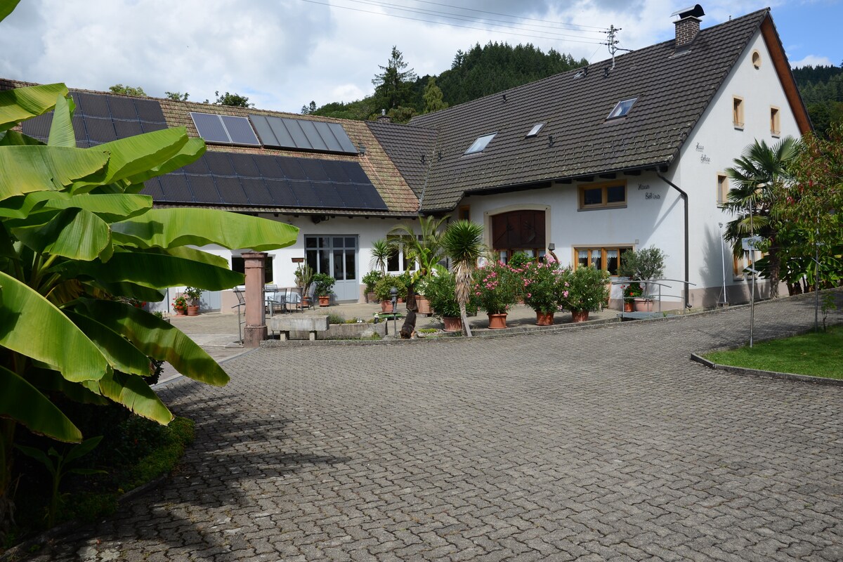 The holiday apartment is located in a village surrounded by the picturesque Black Forest. It accommodates up to five people and features a bedroom, a modern bathroom, and an open-plan living and dining area with a fully equipped kitchen. A lovely terrace invites you to relax and enjoy the rural views. Explore the marked hiking trails directly from the apartment's entrance. Wi-Fi is available, and there is free parking right in front of the apartment.