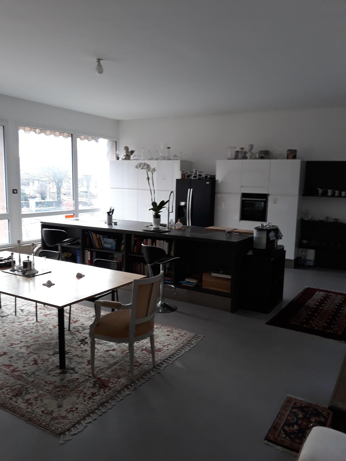 Spacious architect-designed apartment (126 m²) with atypical shapes located in a 19th century mansion. Located in a quiet street, with a view of the canal. Less than 5 minutes to reach the train station or the city center on foot. The apartment is suitable for 4-5 people. It has 2 large bedrooms, one of which has a small balcony. 1 TV room (without window) convertible into a single bedroom. Very large bright living room with office space. Equipped kitchen, spacious bathroom.