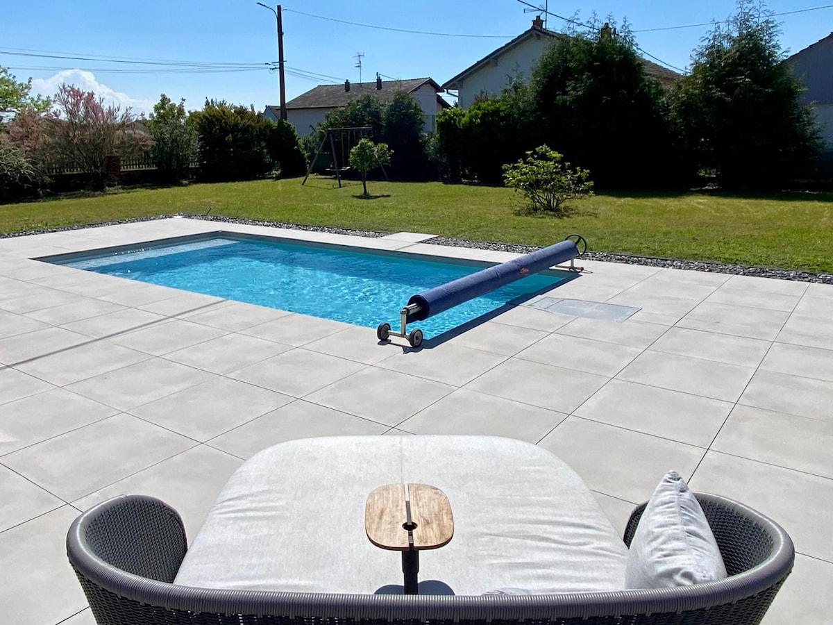 Dans un écrin de verdure, à deux pas des grands axes, notre maison allie élégance, confort et sérénité. Grands volumes baignés de lumière, équipements haut de gamme, cuisine parfaitement équipée, piscine, jacuzzi, jardin paysagé… tout est réuni pour vous offrir une parenthèse de détente et de confort. Idéale pour les familles, les couples ou les amis en quête de calme et de moments partagés, en toute simplicité.