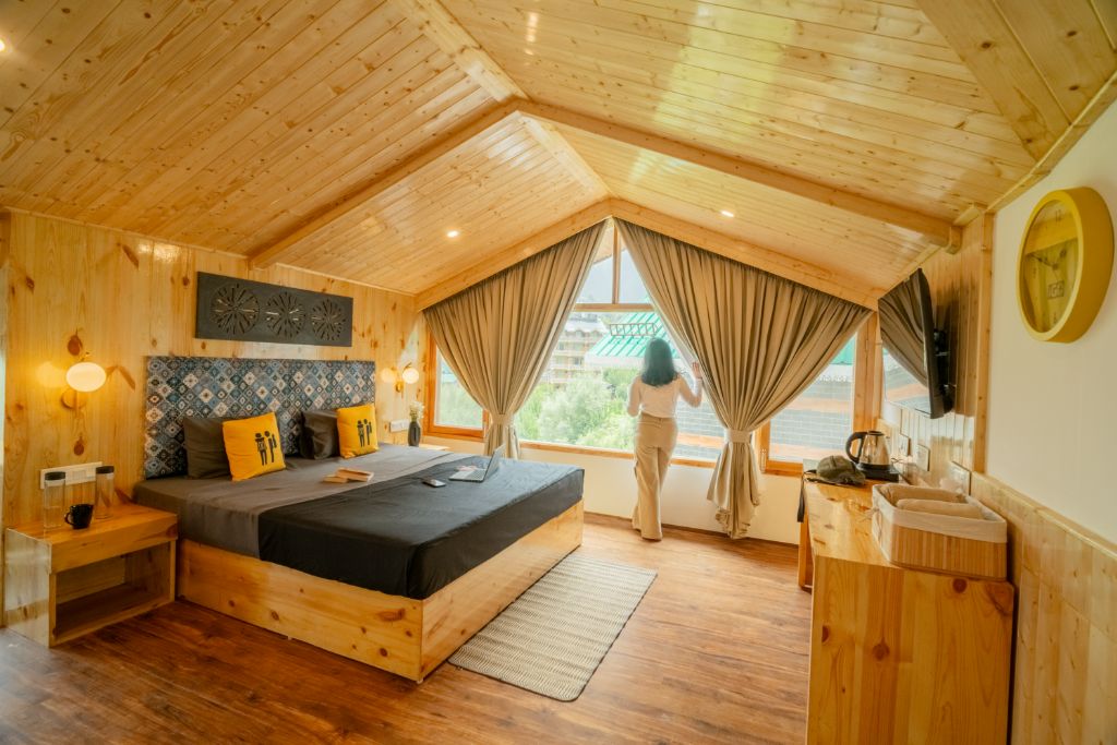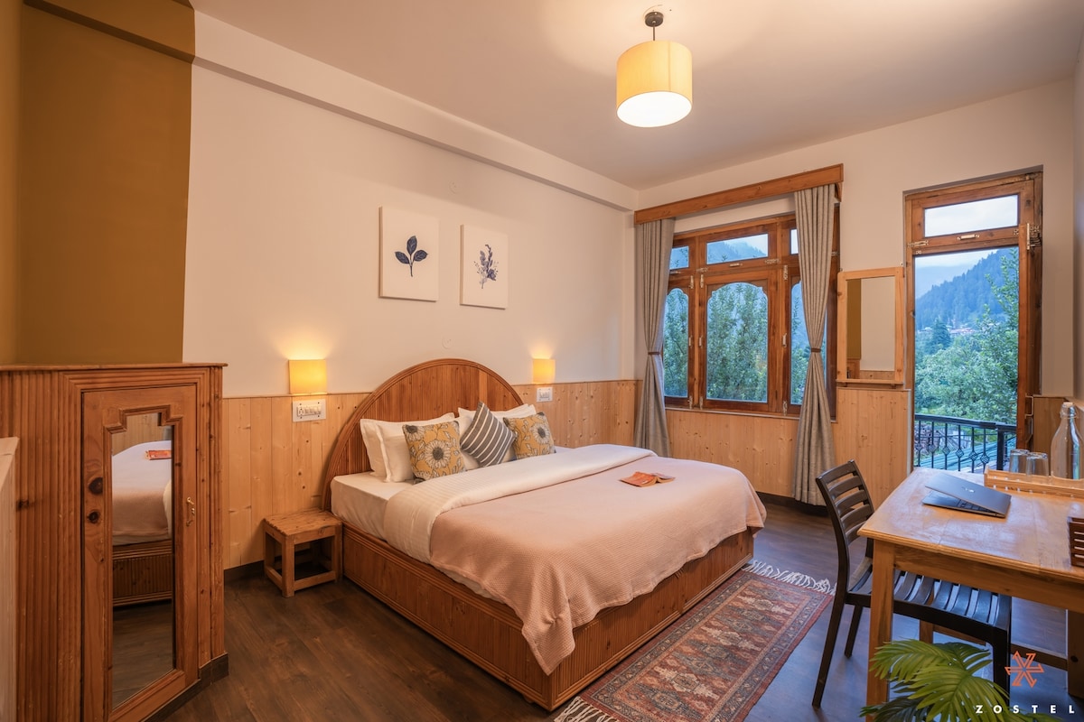 Start fresh with a hot cuppa on your private balcony in this expansive room which comes with a king-size bed, a work desk, a TV, and an ensuite washroom. Zostel’s newest addition in the heart of Old Manali is the perfect crash pad for your mountain adventures. Set aside the curtains and let the sun rays make way for a glimpse at gorgeous peaks and lofty trees. Fill your bellies with drool-worthy food, sip fusion cocktails, and gaze at jaw-dropping views from our in-house café+ bar.