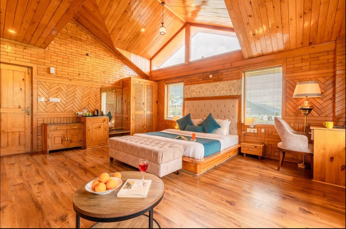 Take a Lazy and Slow Holiday at our unique and secluded cottage. Our cottage is Kathkuni-built, made using upcycled timber and 18inch natural stones that keeps the room insulated at all times, it also has rustic mud interiors that adds to the insulation. The rooms are very spacious, have book nooks, a coffee table and a balcony. We also have an experiential kitchen at our property where we make multi-cuisine food freshly on order.