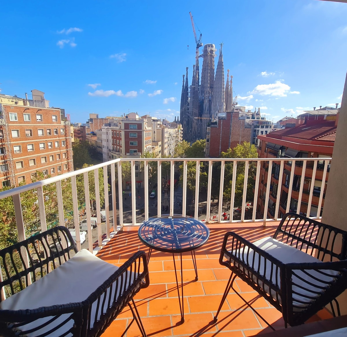Enjoy the best view of La Sagrada Familia in the whole city!. 2 bedrooms both with balconies and 20 m2 living room with 2 balconies more facing the main facade. Lots of natural light in all rooms. Fully equipped kitchen, quality bedding, AA, Heating, Free WiFi. Reception desk in the building for best guest assistance. Huge sunny roof terrace (130 m2) with outside furniture. Excellent central location with connections to all sites just 50 meters from the apartment. Building has NOT elevator