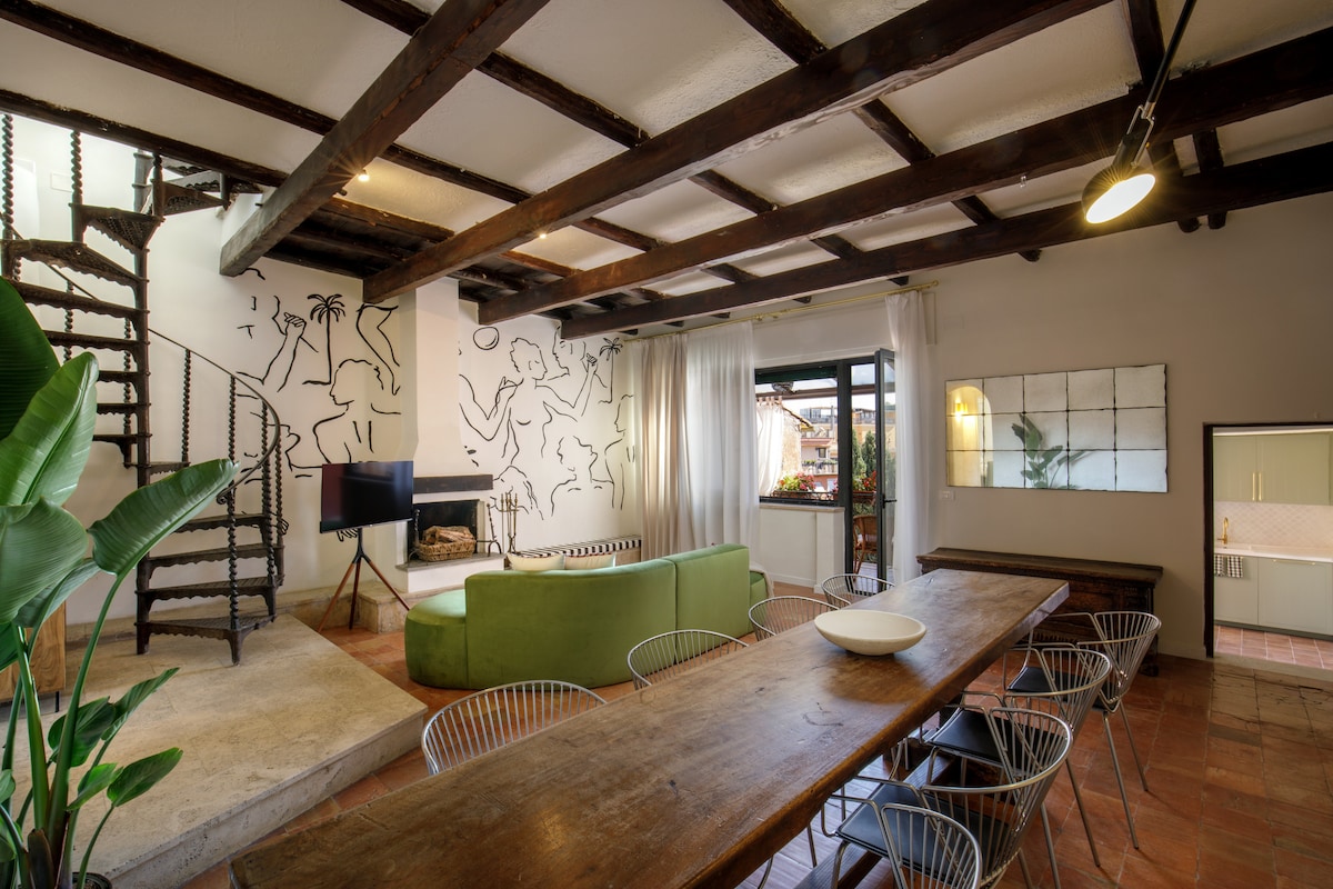 Mastroianni House is a unique apartment located in an early 20th-century building in the picturesque Testaccio neighborhood, a short walk from the Circus Maximus. Spanning 80m2 (861 square feet), it offers a living room, guest bathroom, office area, large wardrobe space, fully equipped kitchen, and a bedroom with an ensuite bathroom. The experience is completed by a large furnished terrace surrounded by greenery. Ideal for couples looking for a romantic stay.