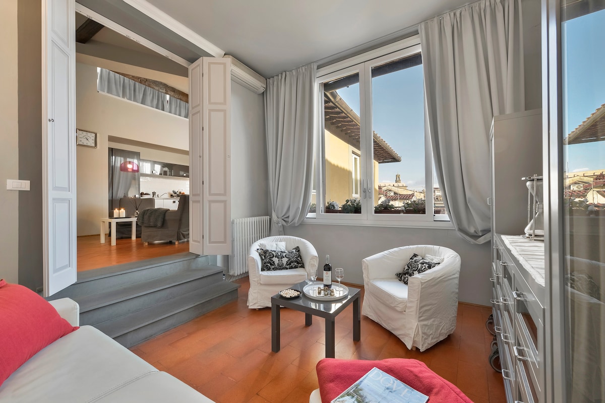 The interiors, bright and brimming with comfort, is a perfect mixture between modern and classic.The perfect apartment for a romantic getaway in the absolute epicentre of buzzing & vibrant shopping area of Florence. The apartment that overlooks the terrace, is composed of a splendid and bright living area with a direct view of the Dome , a kitchenette fully equipped with a dishwasher and a washing machine, and a large double bedroom and a bathroom in Carrara marble.